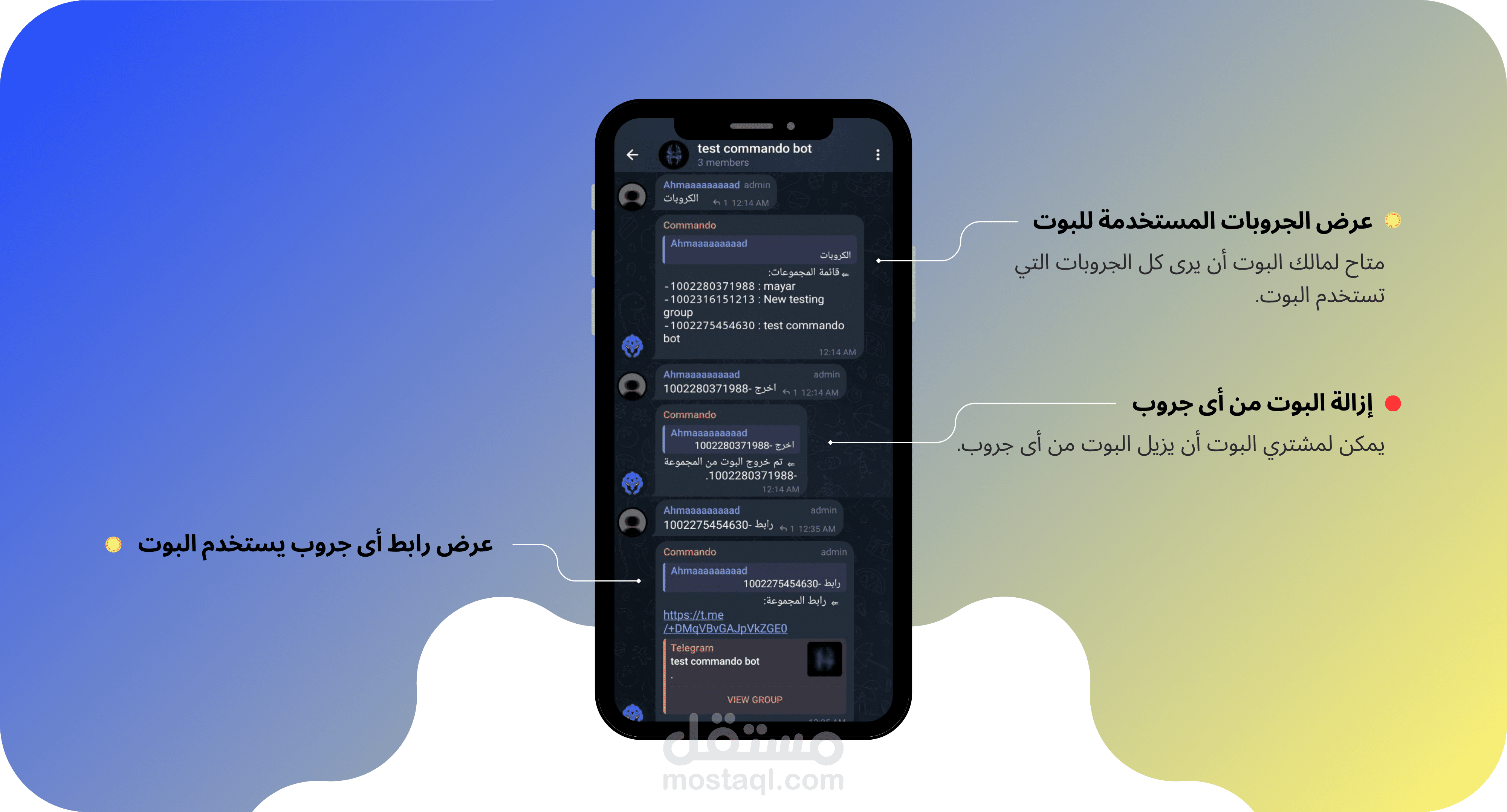 10. البوتات: عرض البوتات الموجودة بالجروب.