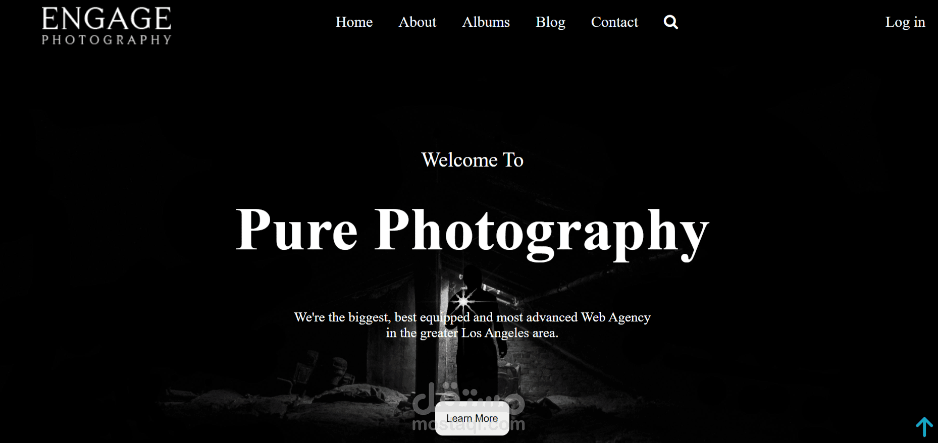 صورة خلفية كبيرة تعكس مظهرًا فنيًا، مع رسالة ترحيب: "Welcome To Pure Photography" وعنوان رئيسي "Pure Photography".