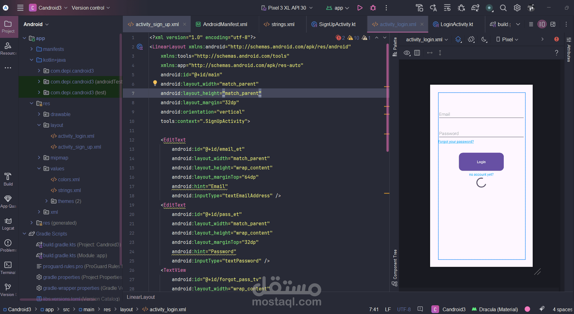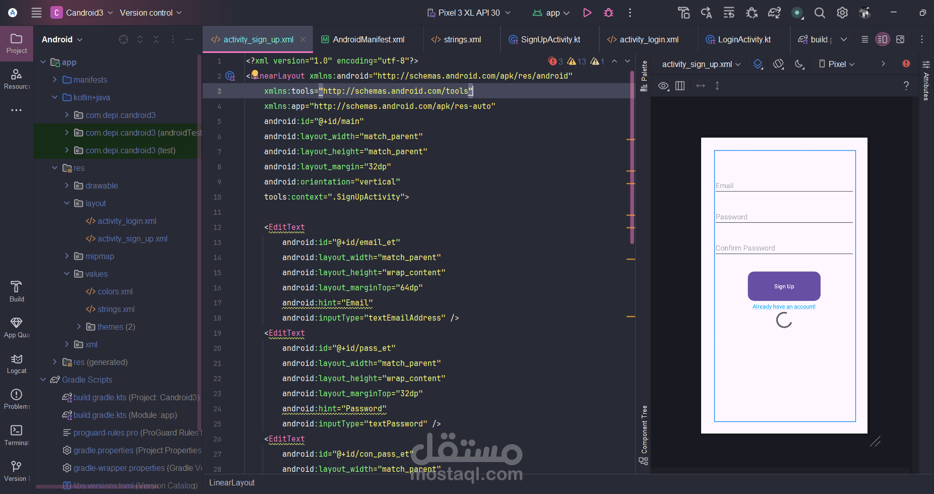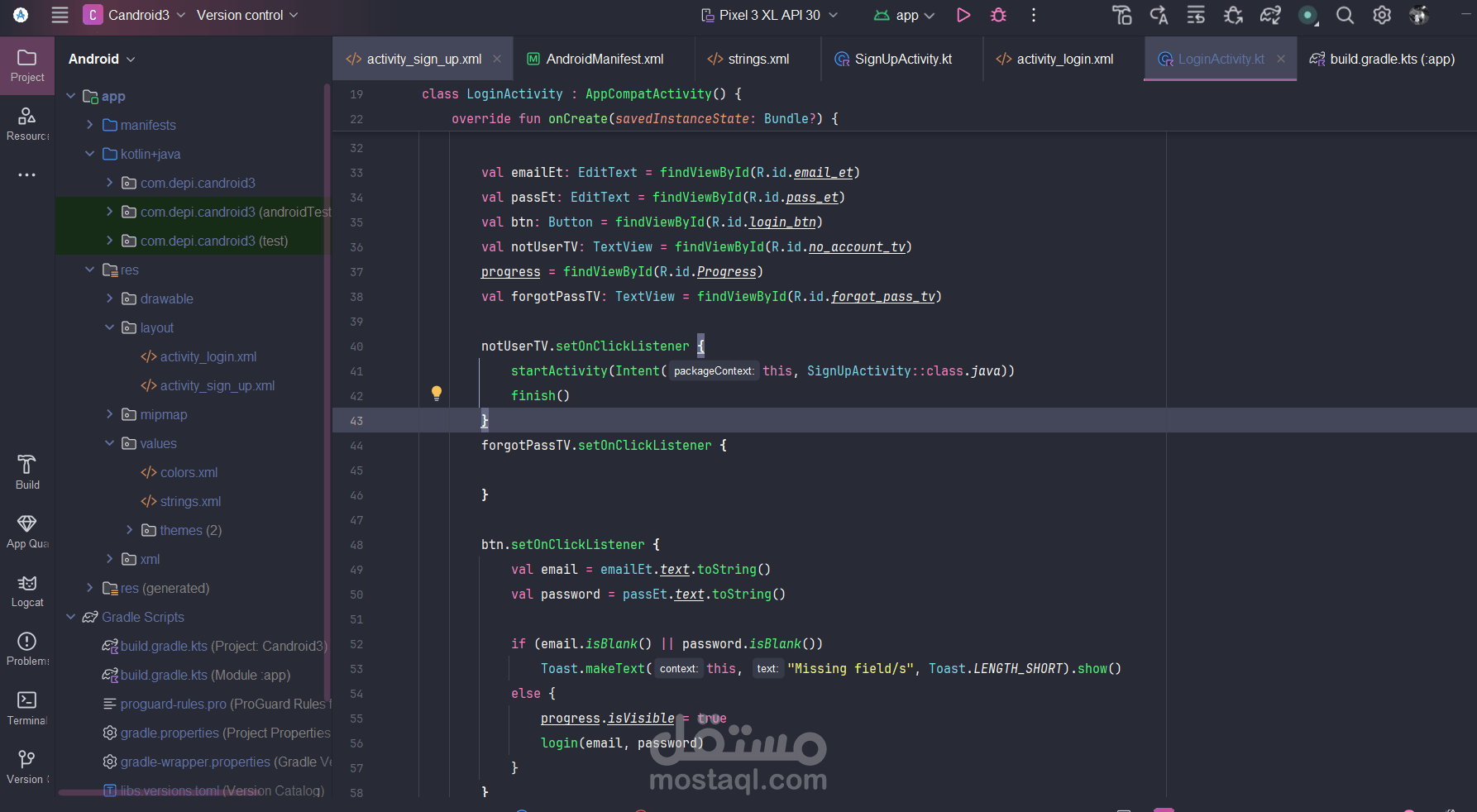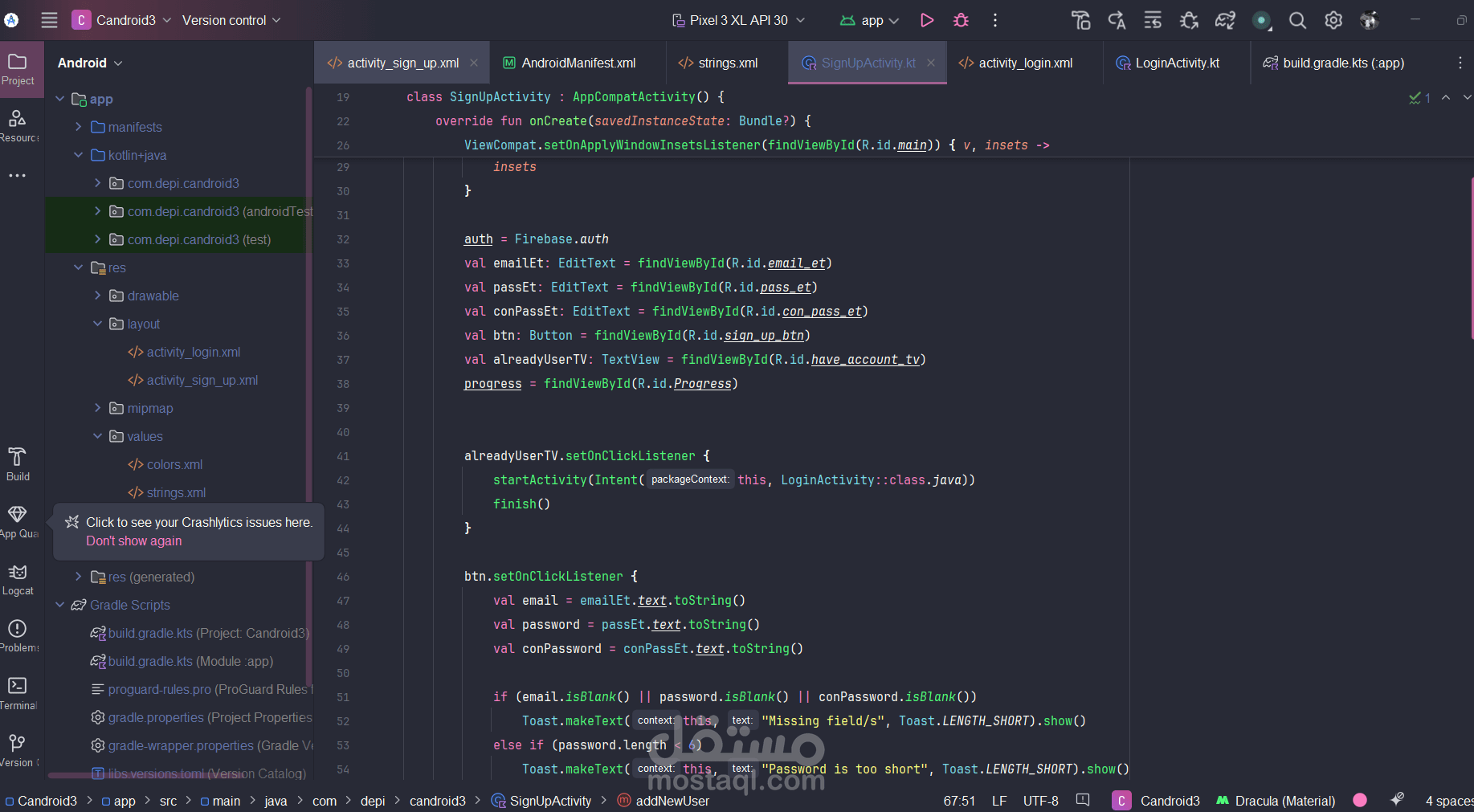 This application includes two essential authentication screens: Sign Up (Registration) Screen and Login Screen, both integrated with Firebase Authentication for secure user management.