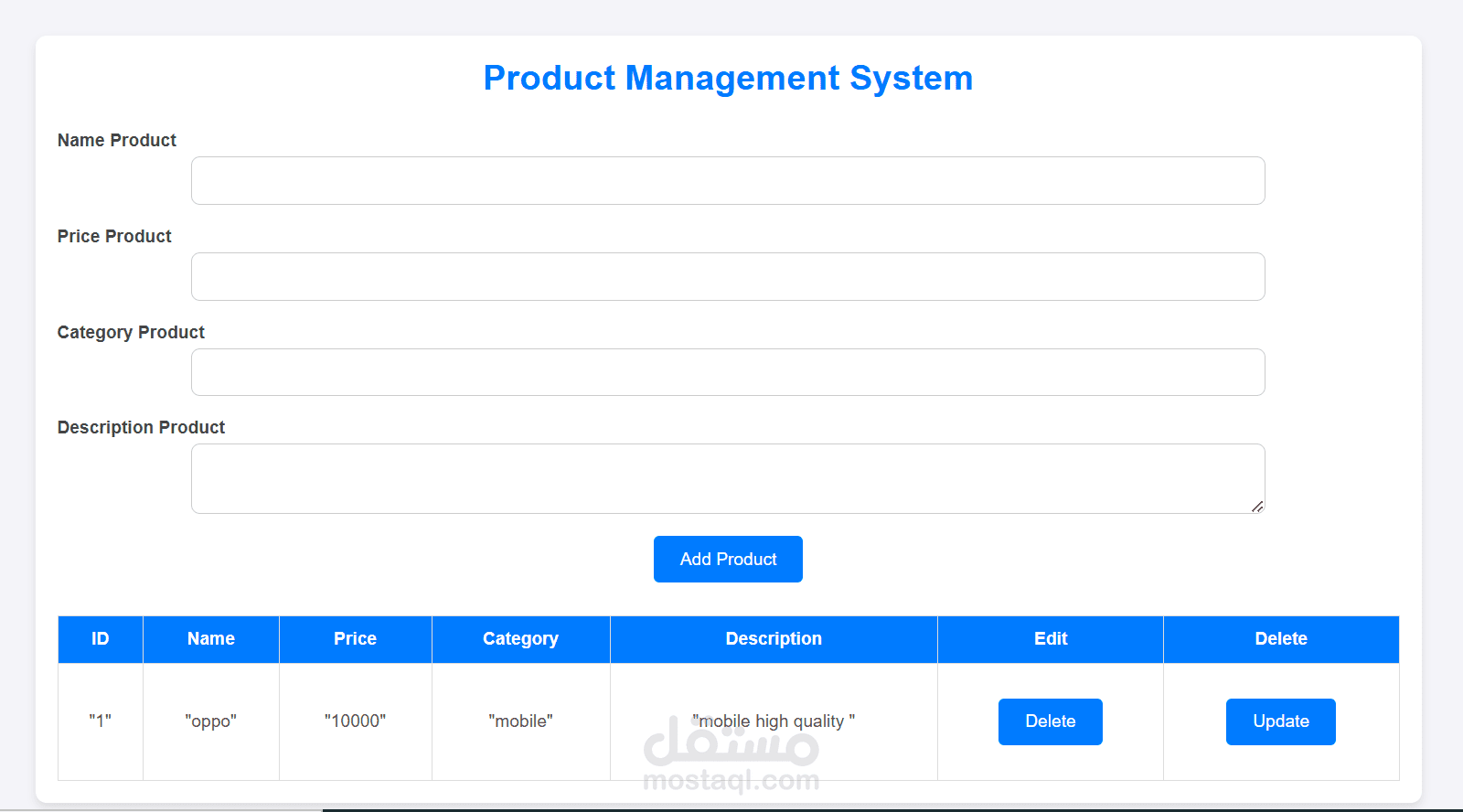عد هذا الموقع بمثابة نظام لإدارة المنتجات، حيث يتيح للمستخدمين إضافة المنتجات المختلفة إلى قائمة منظمة، مع تفاصيل مثل الاسم، السعر، الفئة، والوصف. كما يتيح للمستخدم إمكانية تعديل أو حذف أي منتج من القائمة بسهولة.