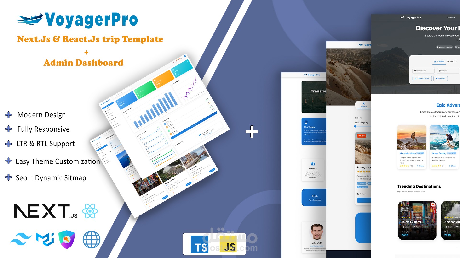 Experience the future of travel technology with VoyagerPro, a premium, all-in-one template crafted for travel agencies, tour operators, and booking platforms. VoyagerPro isn’t just a template—it’s your gateway to building stunning, high-performance platforms with ease. Offering Next.js and Vite projects in both TypeScript and JavaScript, VoyagerPro adapts to your preferred tech stack while delivering the ultimate blend of functionality, design, and scalability.
