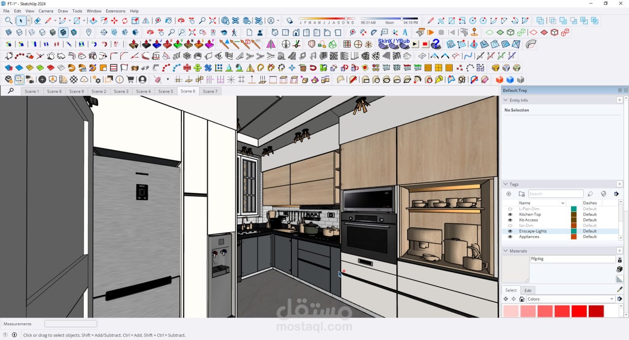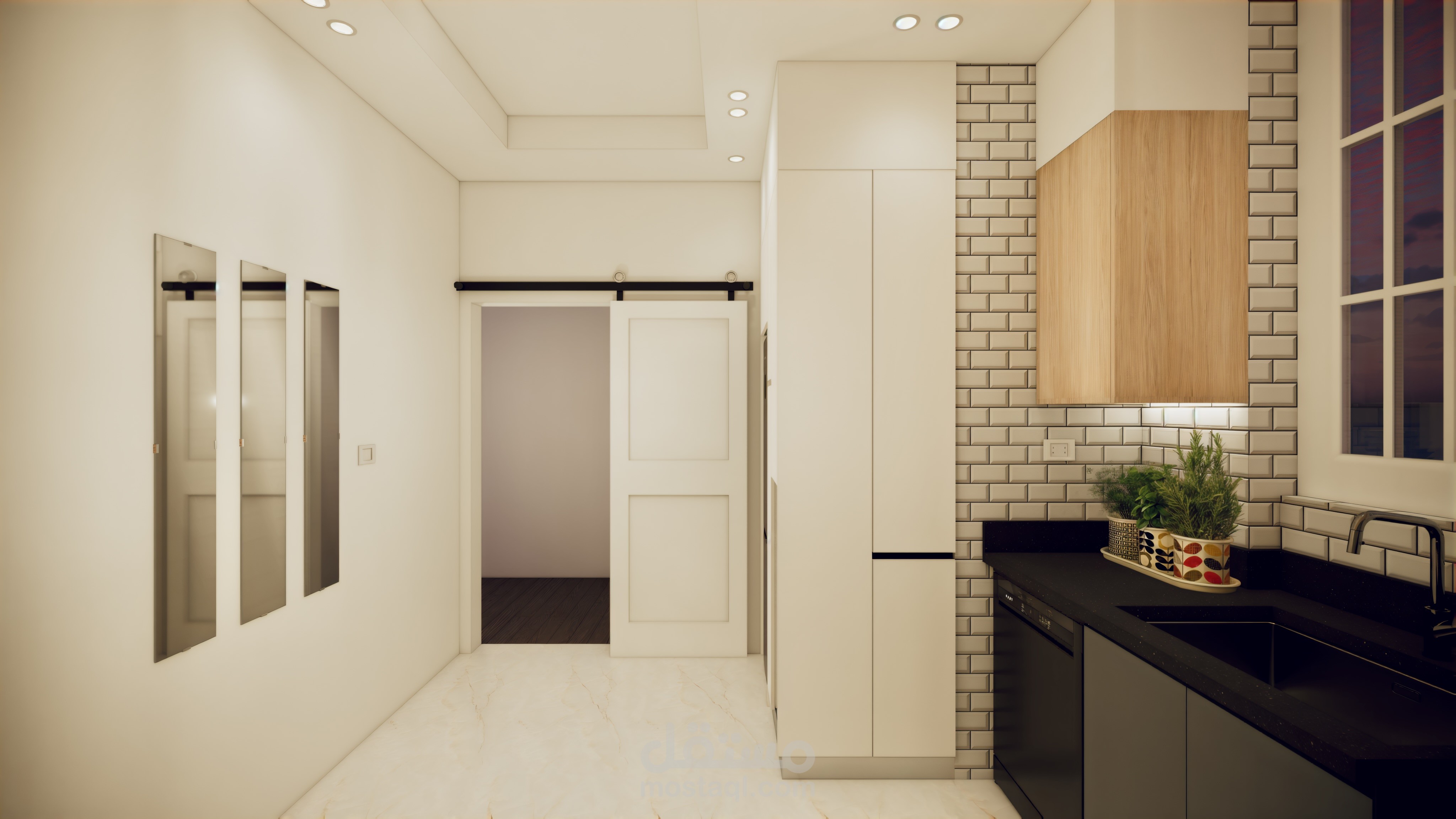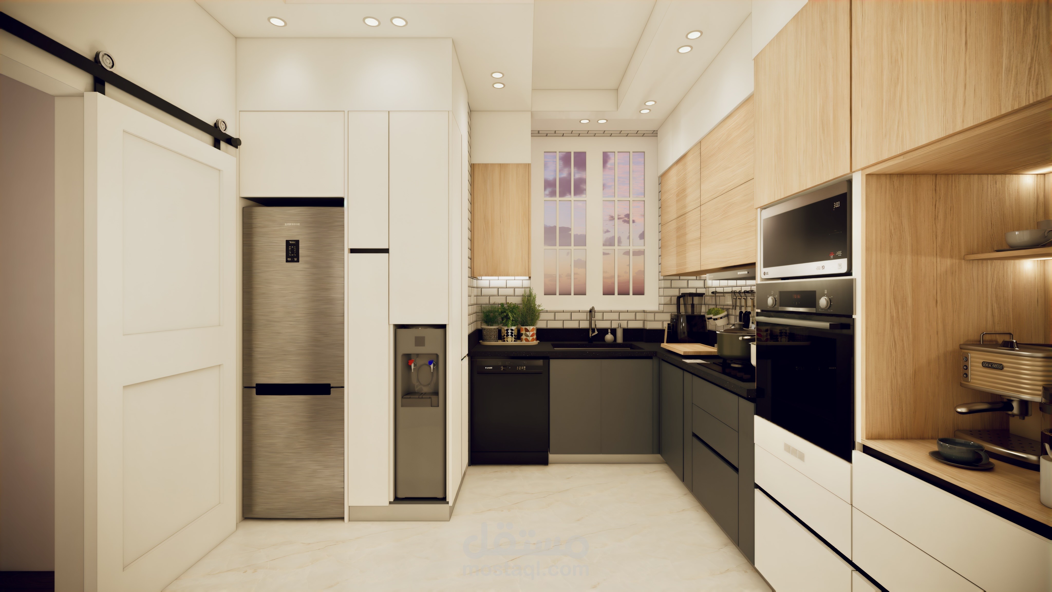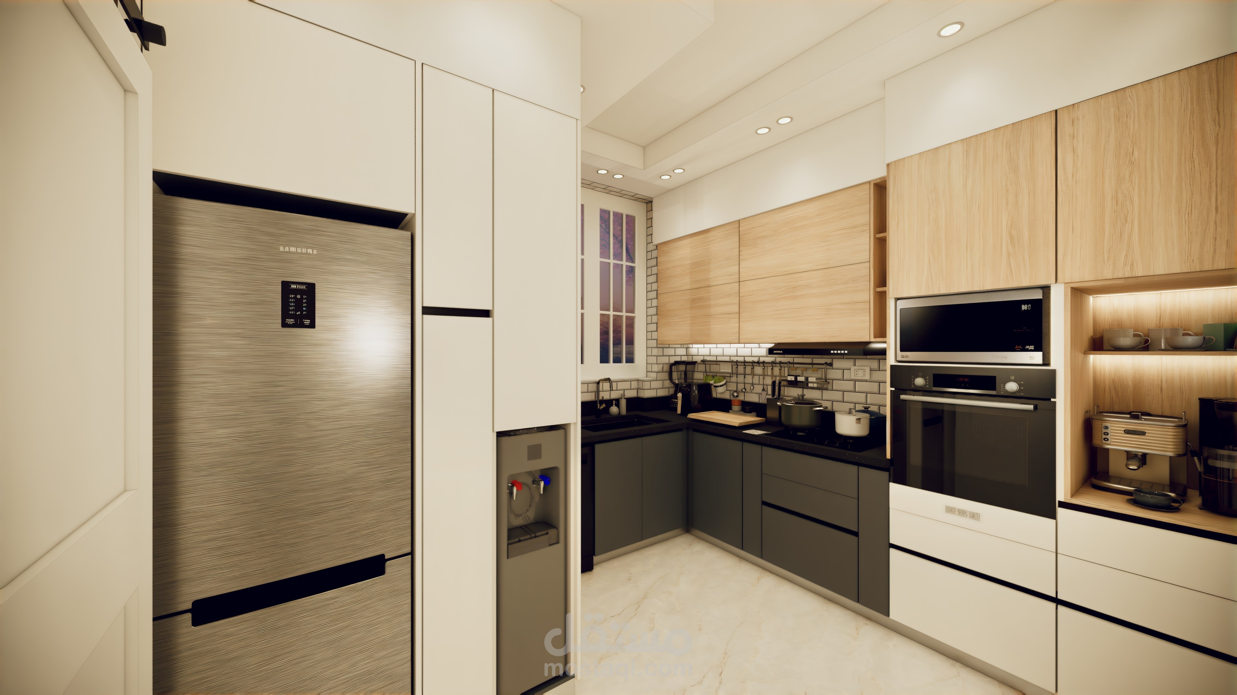 تصميم مطبخ علي مساحة 10 م مع الاخذ في اعتبار ضيق المساحة تم مراعة جميع الوظائف الاساسية وقف معاير تصميم المطابخ و خلق مساحات مميزة مثل كوفي كورنر و دولاب تخزين.