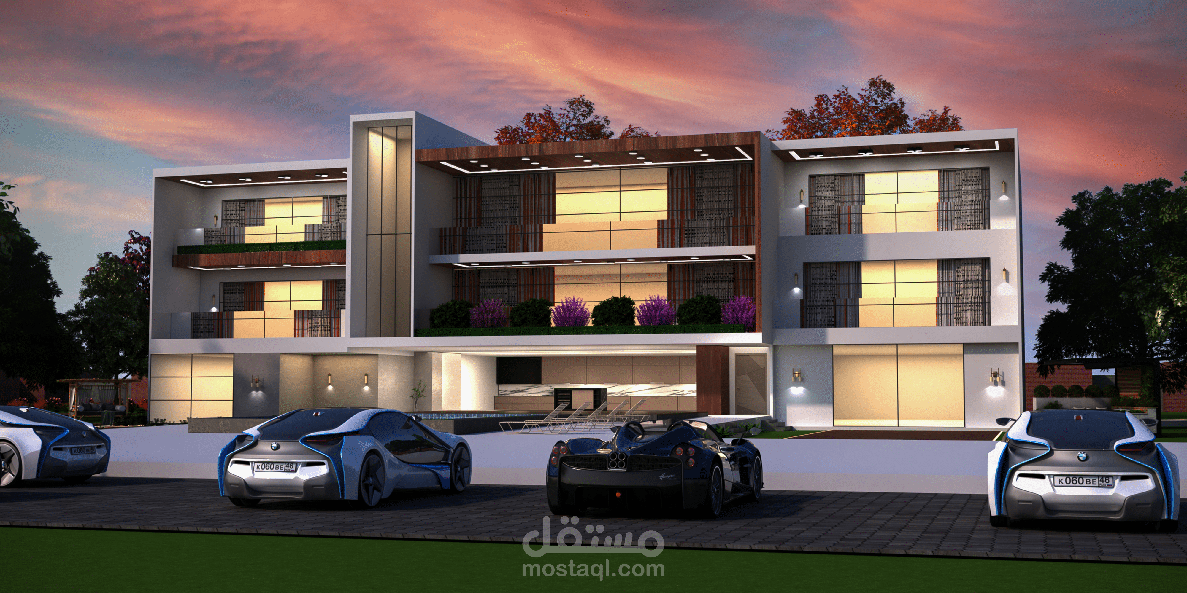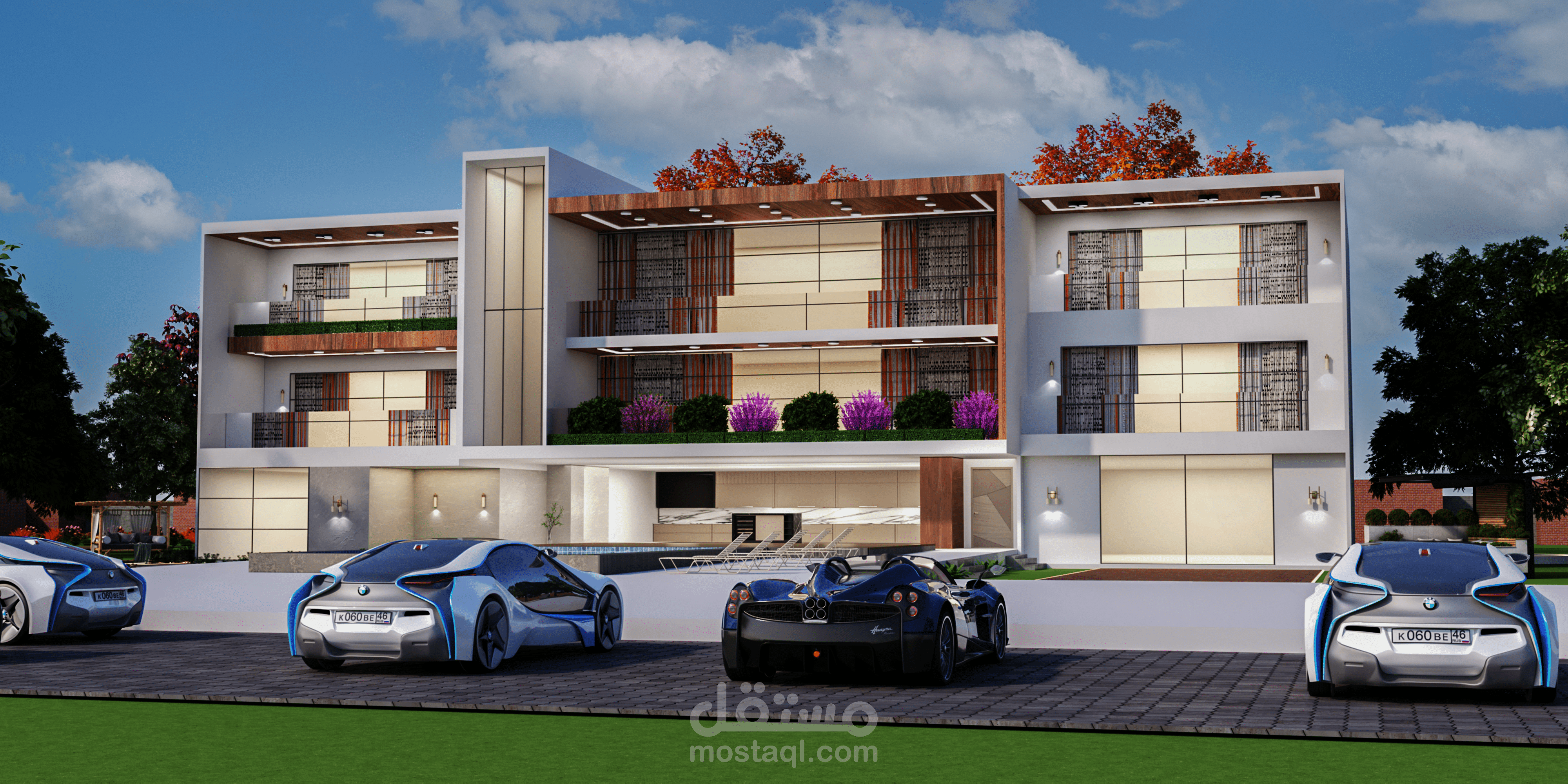 فيلا فاخرة بتصميم عصري وأنيق، تتميز بمدخل فخم بأبواب زجاجية طويلة وجدران مكسوة بالرخام. الواجهة الخارجية تجمع بين الحجر الأبيض الأنيق، والألواح الخشبية، والنوافذ الزجاجية الممتدة من الأرض إلى السقف