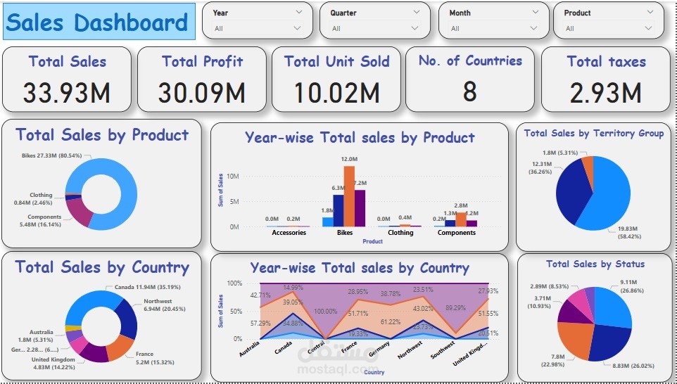 تحليل وتصوير بيانات المبيعات لتقييم الأداء والربحية، مما وفر رؤى قيمة لمديري المبيعات. باستخدام Power BI، تم تطوير لوحات معلومات تفاعلية لتتبع مؤشرات الأداء الرئيسية (KPIs) مثل إجمالي المبيعات، وهوامش الربح، واتجاهات الإيرادات، والأداء الإقليمي. حدد التحليل المنتجات الأكثر مبيعًا، والفئات الأكثر ربحية من العملاء، والاتجاهات الموسمية التي تؤثر على المبيعات. من خلال التقارير الديناميكية والسرد البصري، تمكن مدراء المبيعات من اتخاذ قرارات مبنية على البيانات لتحسين استراتيجيات البيع وتعظيم الربحية.