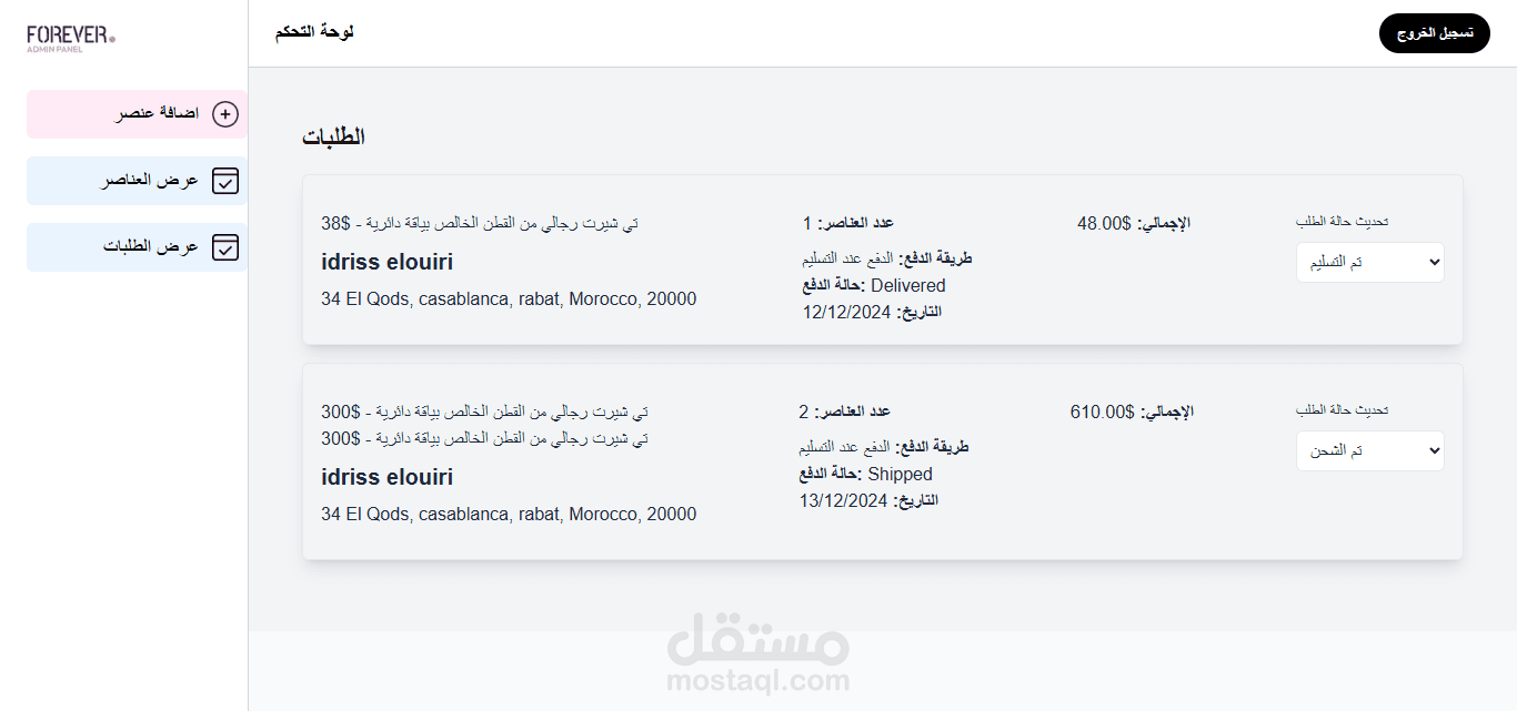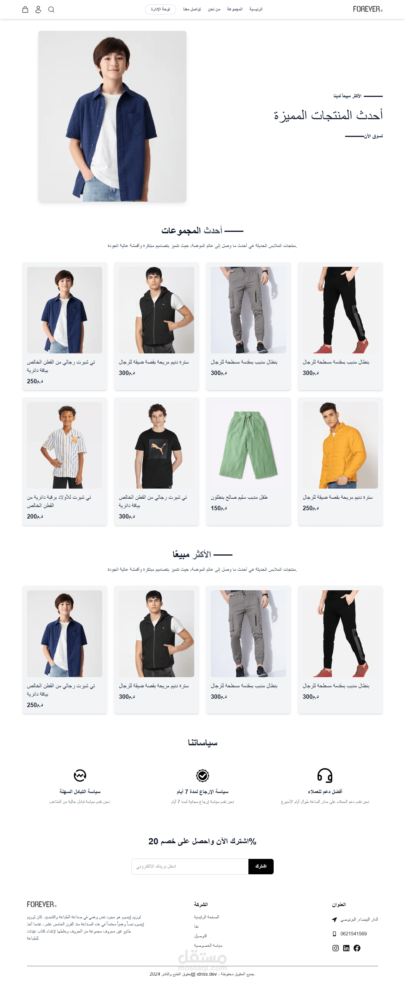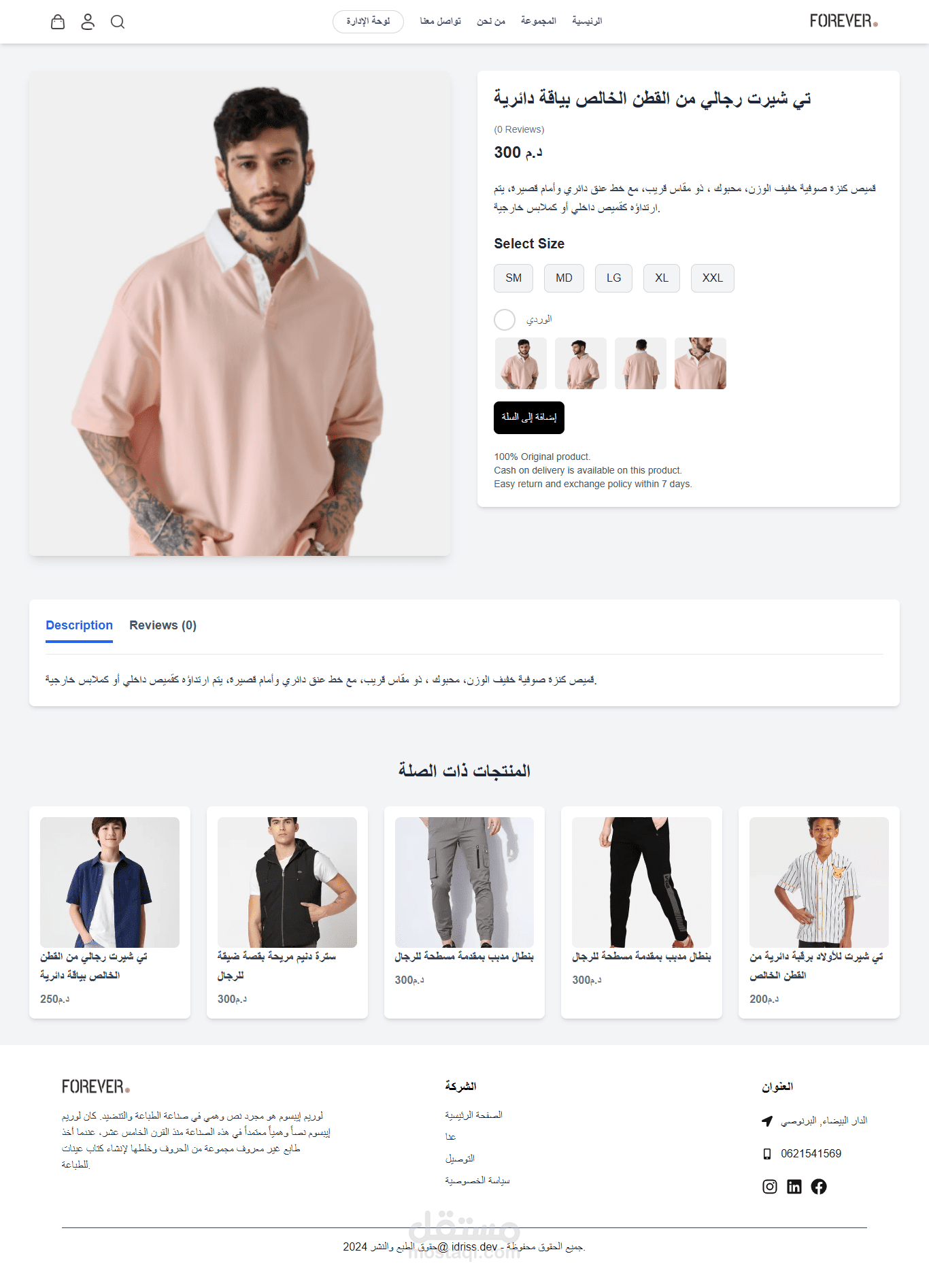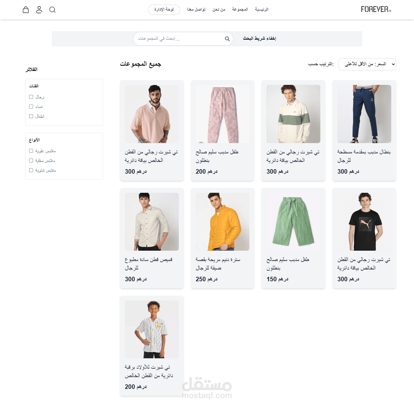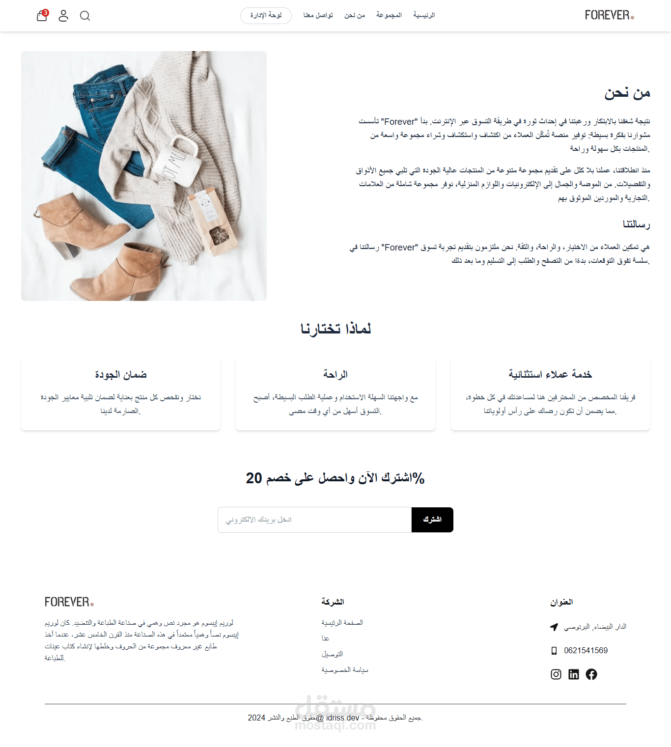 متجر الملابس هو متجر ملابس إلكتروني عصري بتصميم أنيق وسهل الاستخدام، يعرض المنتجات بطريقة أنيقة وجذابة. يقدم الموقع تجربة تسوق سلسة، بصور عالية الجودة، ووصف مفصل للمنتجات، ونظام بحث وتصفية دقيق يُمكّن العملاء من العثور على ما يبحثون عنه بسرعة. صُمم الموقع باستخدام أحدث تقنيات الويب، مما يضمن أداءً سريعًا، وتوافقًا مع مختلف الأجهزة، وتجربة مستخدم مثالية.