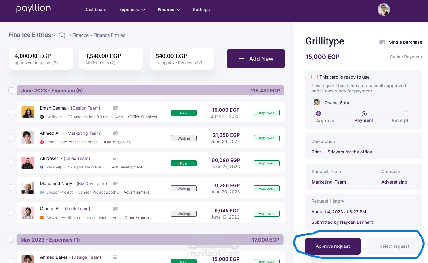 نظام إدخال وإدارة نفقات سلس لتتبع وتنظيم النفقات التي يدفعها العميل.