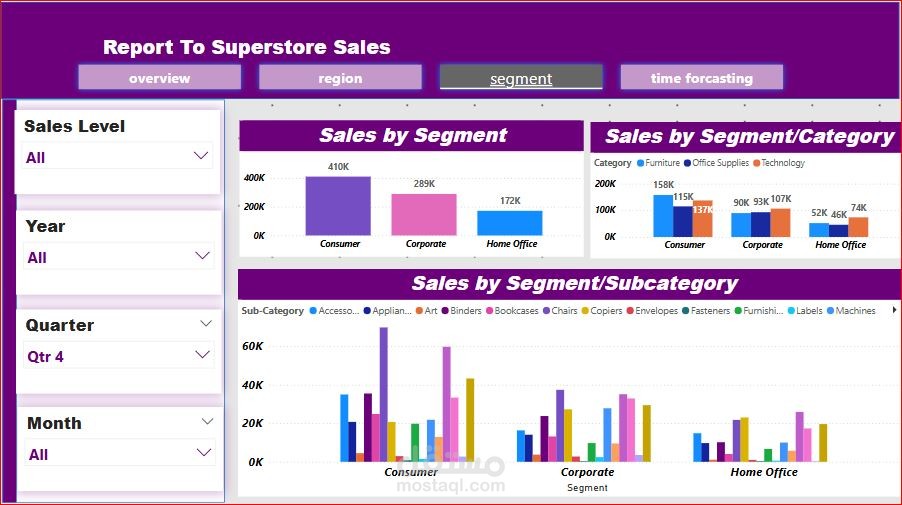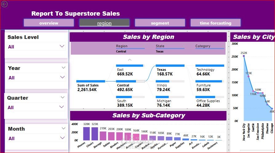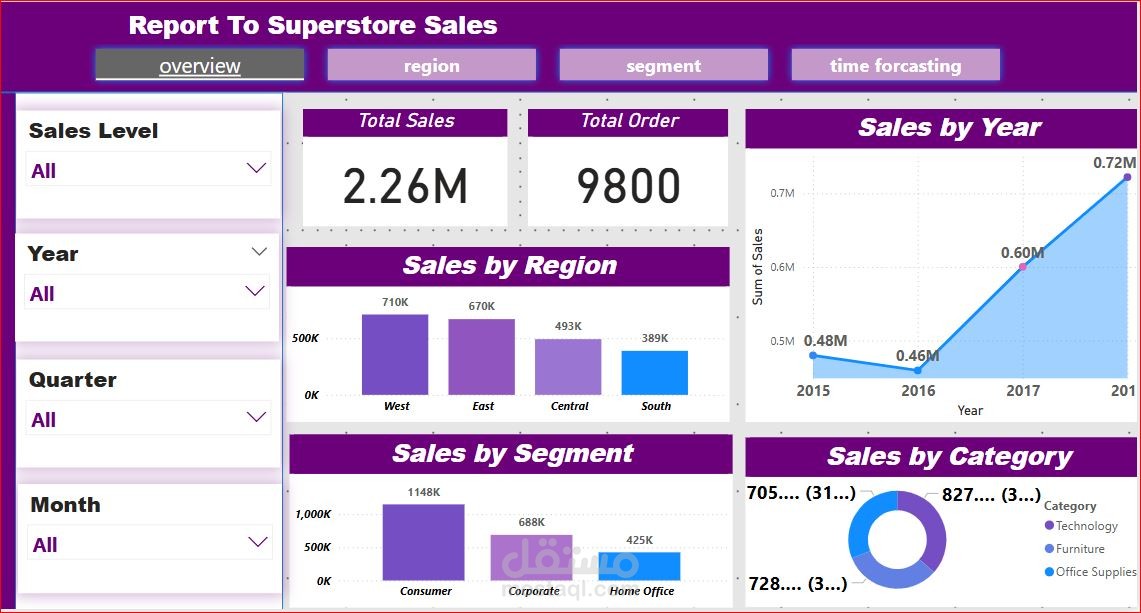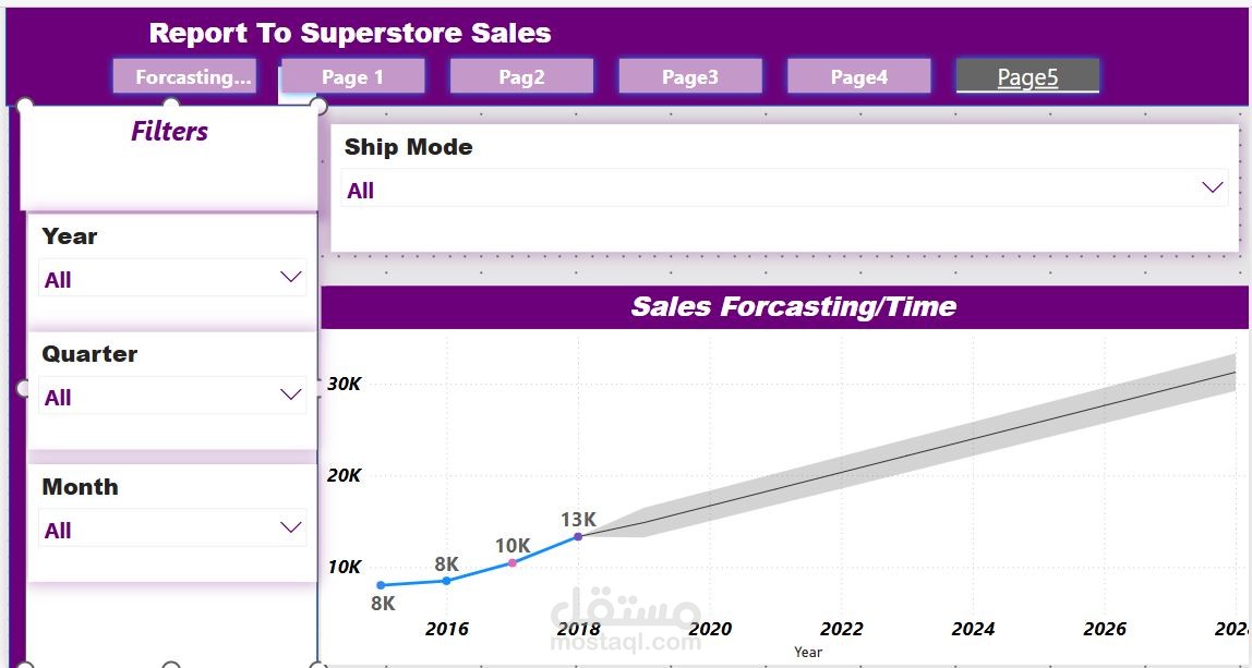 قمت بعمل تنظيف للبيانات باسثخدام برنامج الأكسيل والبايثون وذلك بحذف المكرارات ووضع تصور للقيم الفارغة وتحديد نوع كل بيان . وقمت بتحديد الأسئلة المراد الأجابة عليها . ومن خلال برنامج ال (Power bi) قمت بعمل تقرير تفاعلى مكون من خمس صفحات للأجابة على هذة الأسئلة وهى أجمالى المبيعات للدول والولايات والمناطق ومعرفة الأيام والشهور والسنين التى يزداد فية المبيعات ونسبة المبيعات طبقا لنوع المنتج و المنتج الفرعى لتحديد المنتجات الأكثر طلبا مع اضافة بعض الفلاتر التى تساعد فى تسهيل الوصول للمعلومة وإتخاذ القرار وتوقع حجم المبيعات فى السنوات القادمة و معرفة انواع العملاء واكثر العملاء المحققين لأعلى نسبة مبيعات