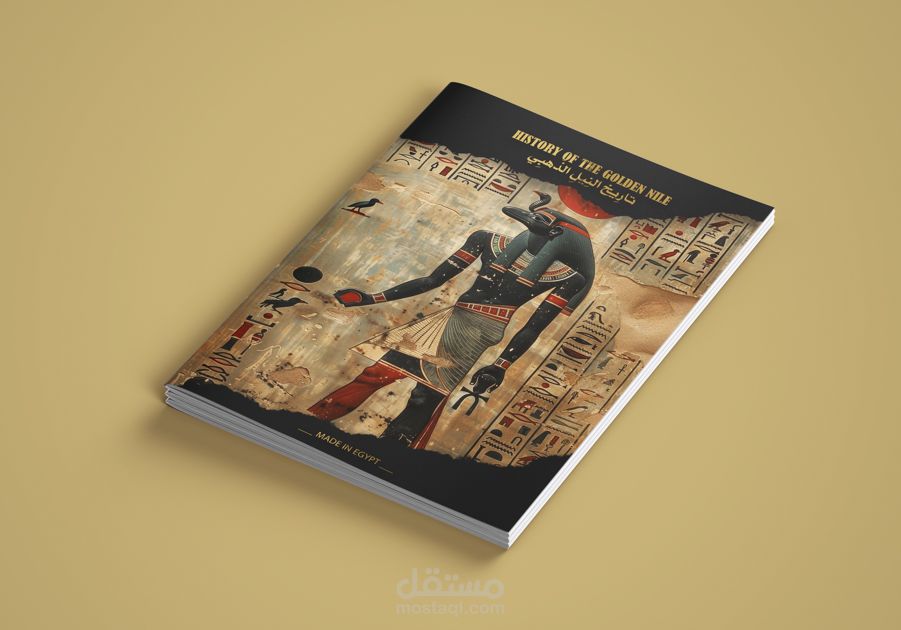 هذا تصميم لغلاف مجله فرعونيه بعنوان تاريخ النيل الذهبى حيث قمت بتصميمها و تطبيق التصميم على mockup لاظهار المطلوب الاساسى من التصميم وهو غلاف المجله