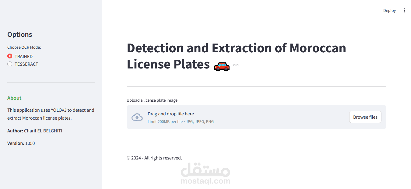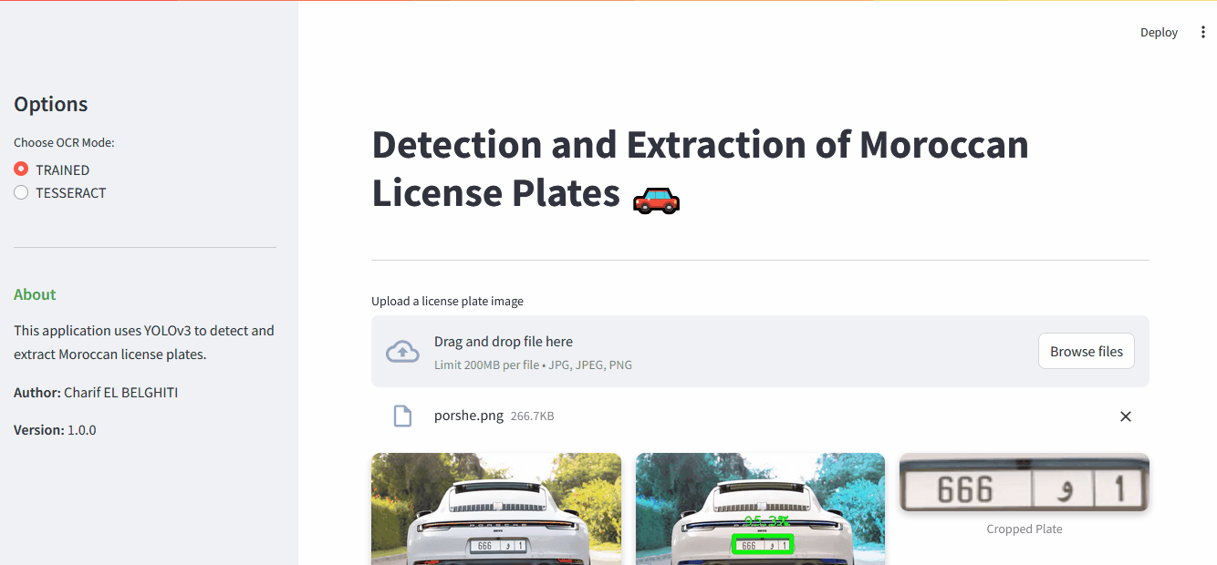 • تم استخدام خوارزمية YOLO المتطورة للكشف عن لوحات السيارات في الصور، حيث تم تدريب النموذج على مجموعة كبيرة من لوحات السيارات المغربية المصنفة يدويًا