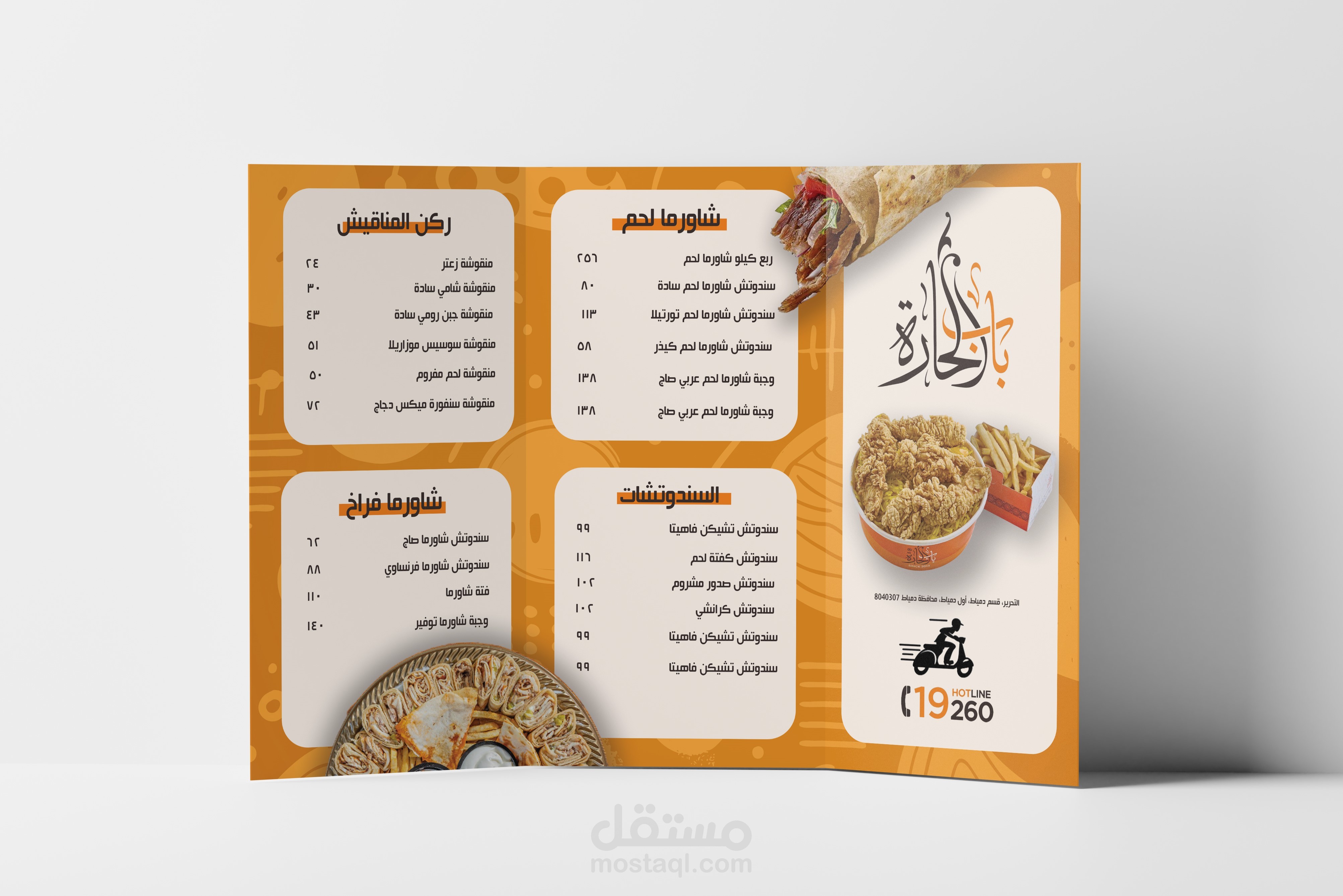 يعتمد التصميم على ثلاث طيات مما يتيح تنظيم المحتوى بشكل مرتب وسهل التصفح، مع ألوان برتقالية دافئة