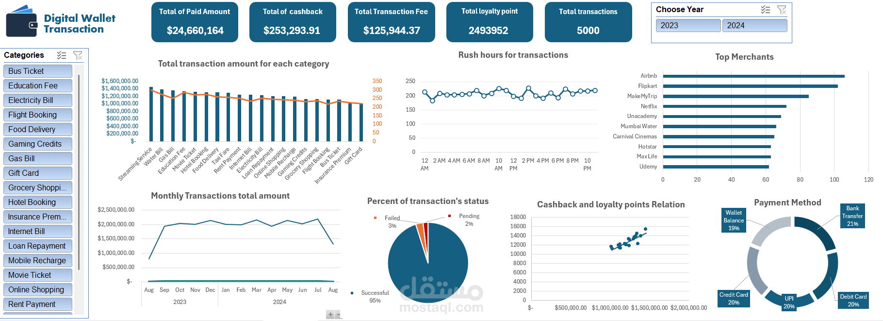 An interactive Digital Wallet Transaction Dashboard designed in Microsoft Excel to analyze and visualize transaction data from 2023 and 2024. The dashboard provides insights into user transactions, payment methods, merchant activity, and more, helping stakeholders make informed decisions.