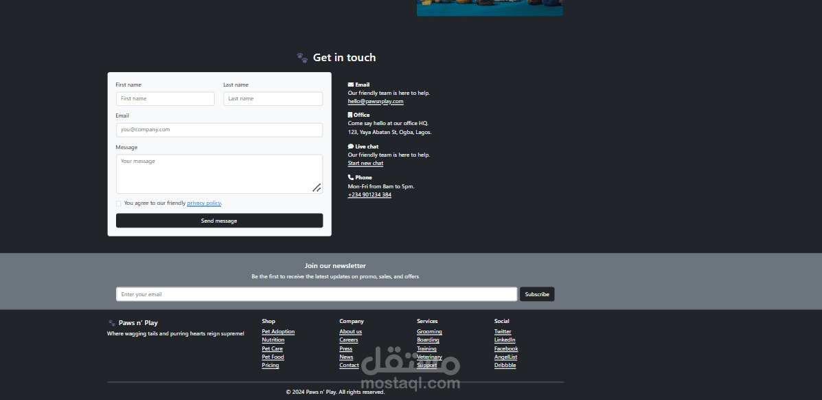 The **Paws n' Play** website is an engaging and visually appealing platform dedicated to pet lovers. The homepage features a high-quality image of a happy golden retriever, immediately creating a welcoming and friendly atmosphere. The tagline, *"Pawsitively Perfect: Where Every Pet's Dream Comes True!"*, reinforces the site's purpose—offering products and services tailored to pet owners.