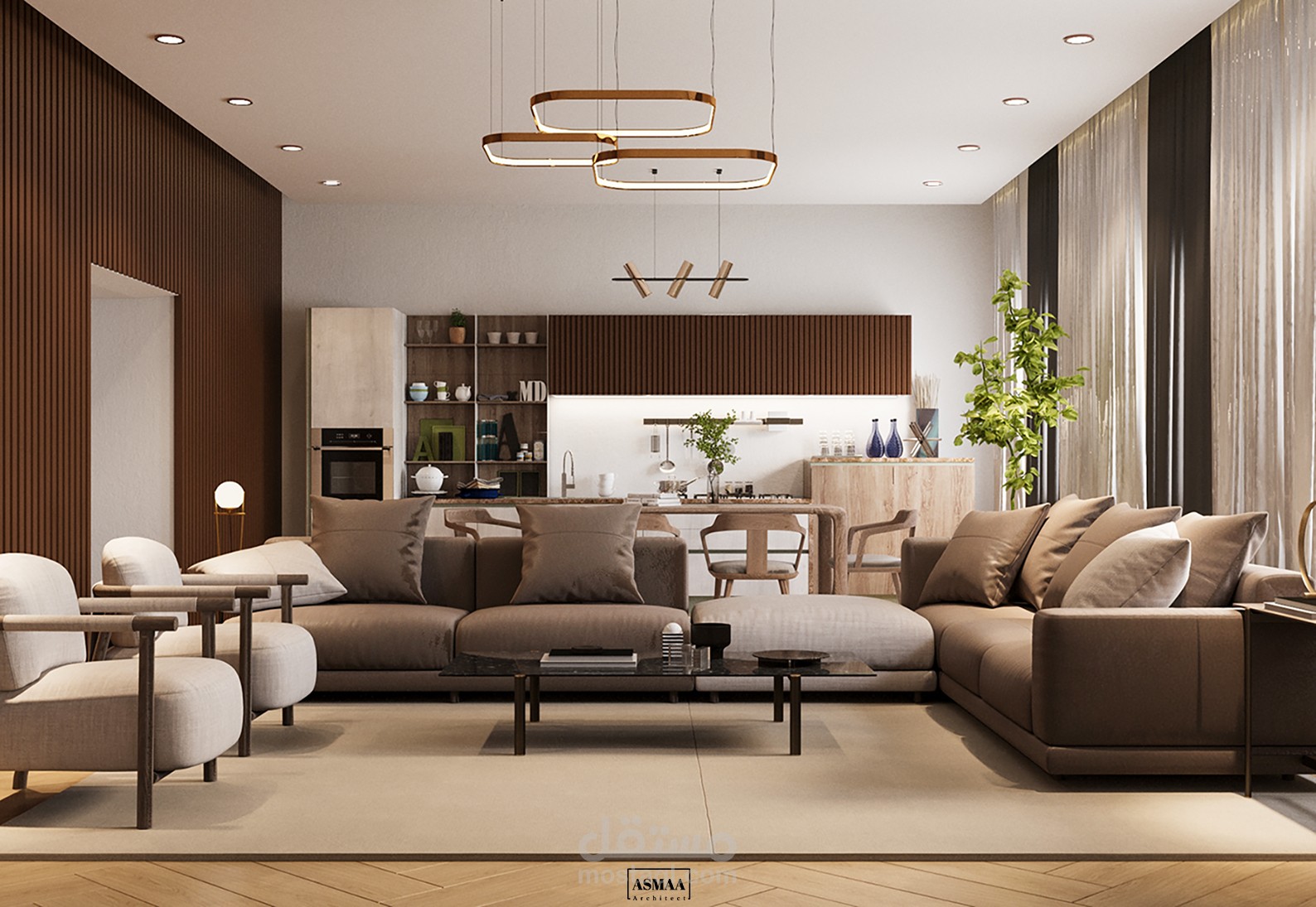 هذا التصميم مثال رائع على كيفية تحقيق التوازن بين الوظيفة والجمال في مساحة مفتوحة. مناسب للمنازل العصرية التي تسعى للراحة والانسيابية.