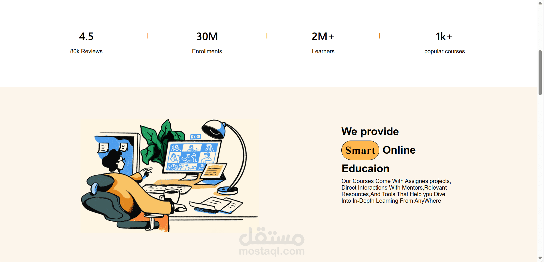 تم تطوير وتصميم صفحة هبوط احترافية لمنصة تعليمية باستخدام HTML وCSS. يهدف التصميم إلى تقديم تجربة مستخدم سلسة وجذابة تعرض الدورات التدريبية والمميزات بشكل واضح ومريح.