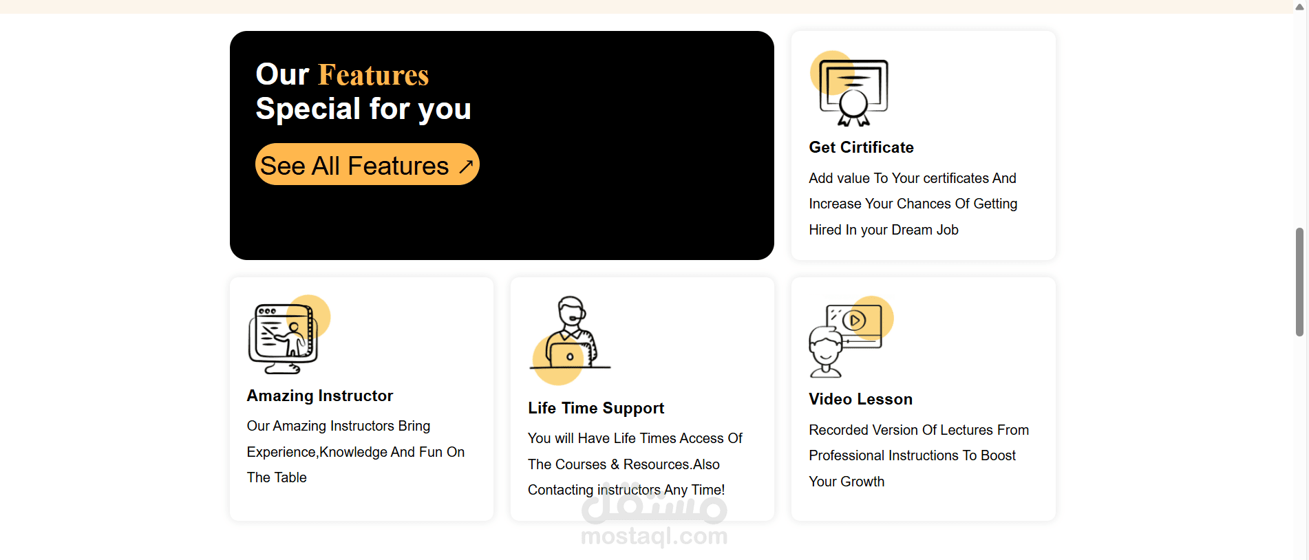عرض المميزات الأساسية (الدروس المسجلة، الدعم، الشهادات).