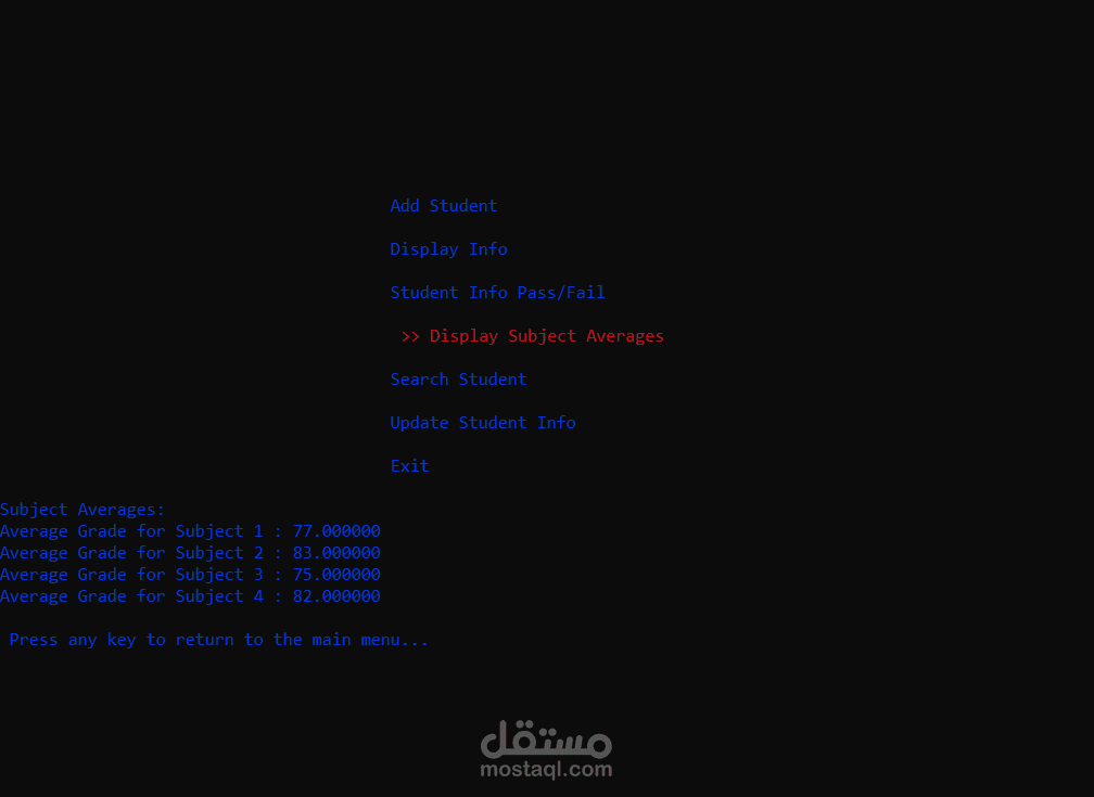 بشكل بسيط و سهل للمستخدم بالاضافه اي اظهار جميع بيانات الطلاب و حالات النجاح و الرسوب يظهر ع شكل منيو يمكن من خلالها المستخدم من اختيار اي شئ سيقوم بعمله و تسجيل هذا الامر و يمكنه سحب و اضافه المعلومات من خلال الفايل