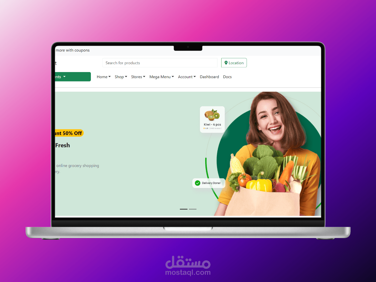 واجهة مستخدم غنية بميزات تفاعلية مثل الـ Carousel, Mega Menu, Product Cards