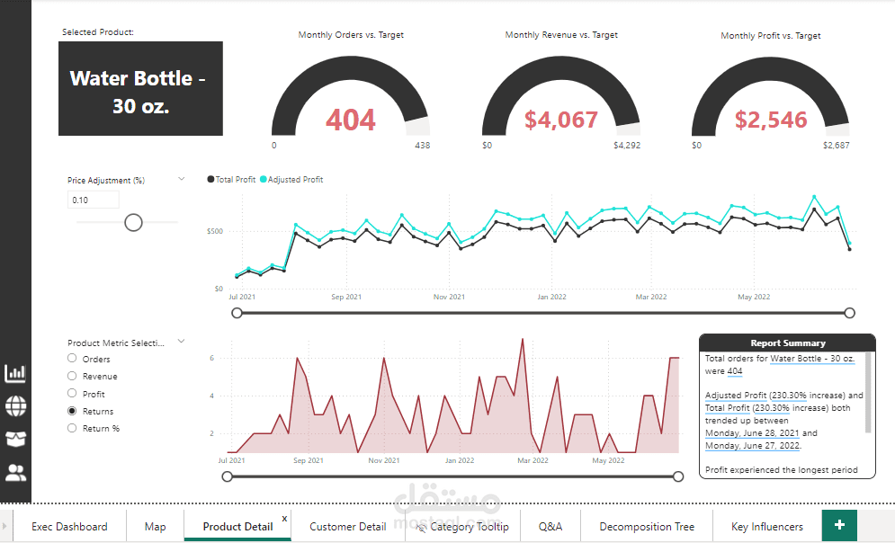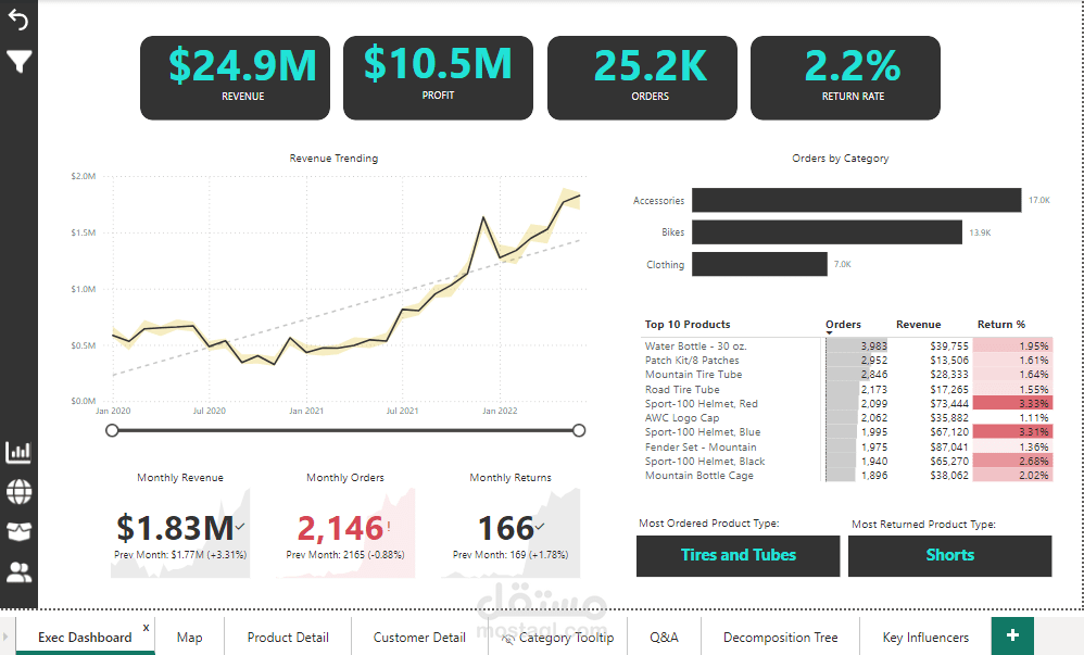 - عرض المؤشرات الرئيسية: الإيرادات (24.9 مليون)، الأرباح (10.5 مليون)