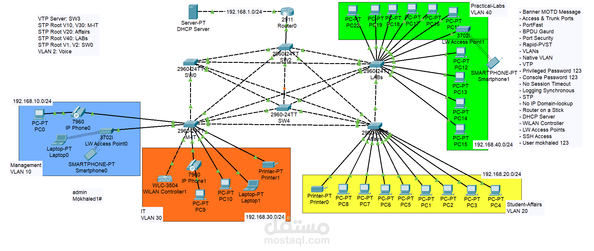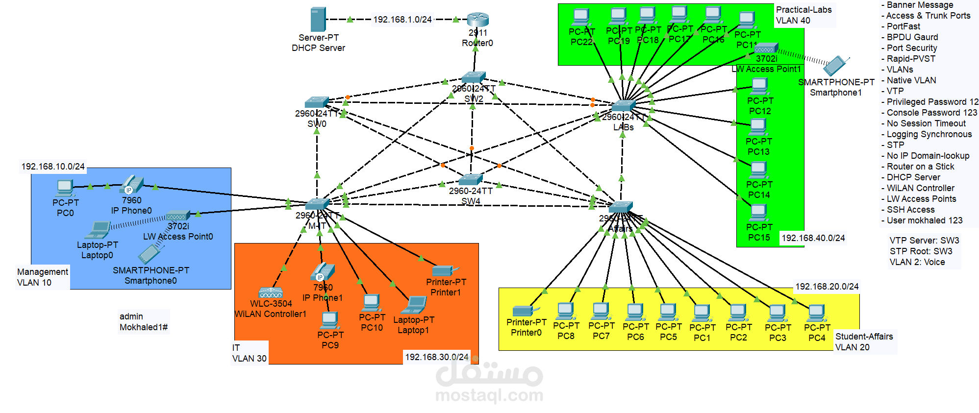 - إعداد VLANs مع Native VLAN للتقسيم والعزل، وإدارتها مركزيًا عبر VTP.