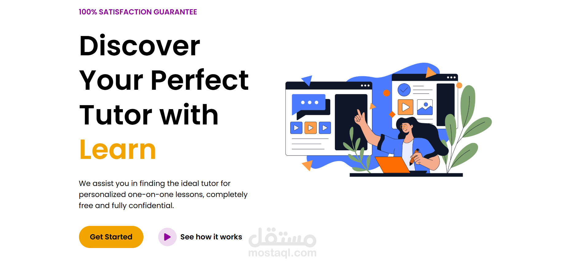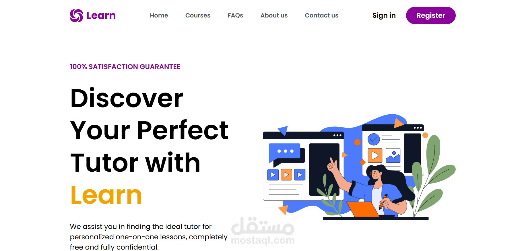 قمت بتحويل تصميم Figma إلى تطبيق ويب احترافي لمنصة Learn، وهي منصة تنشر الدورات التعليمية حيث يمكن للعملاء تصفح الدورات والمحتوى، لكن عملية الدفع تتم في المقر الرئيسي للمؤسسة قبل الحصول على الوصول الكامل للدورة.