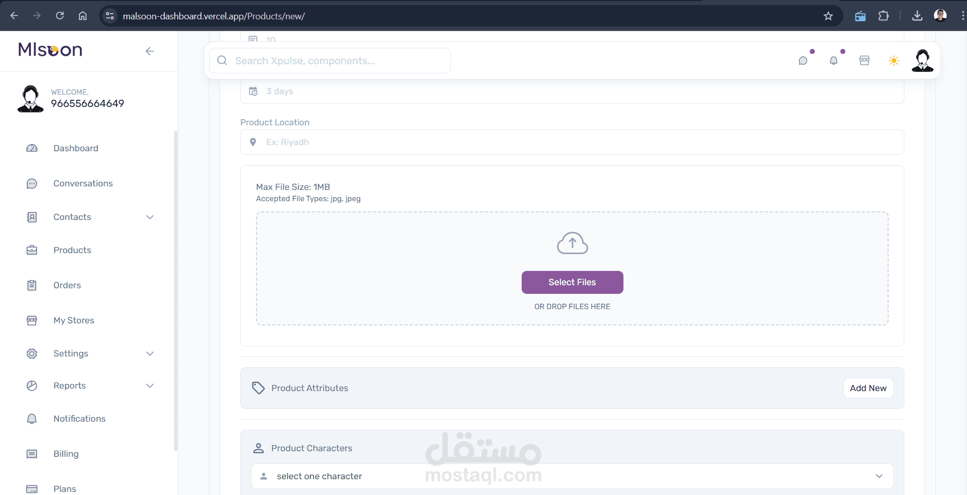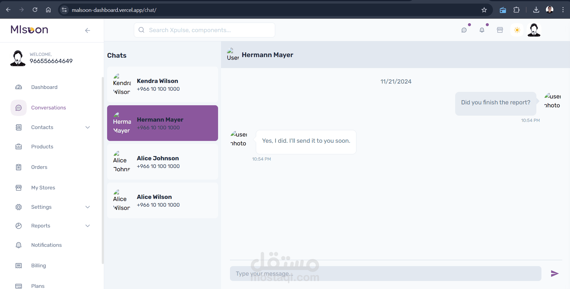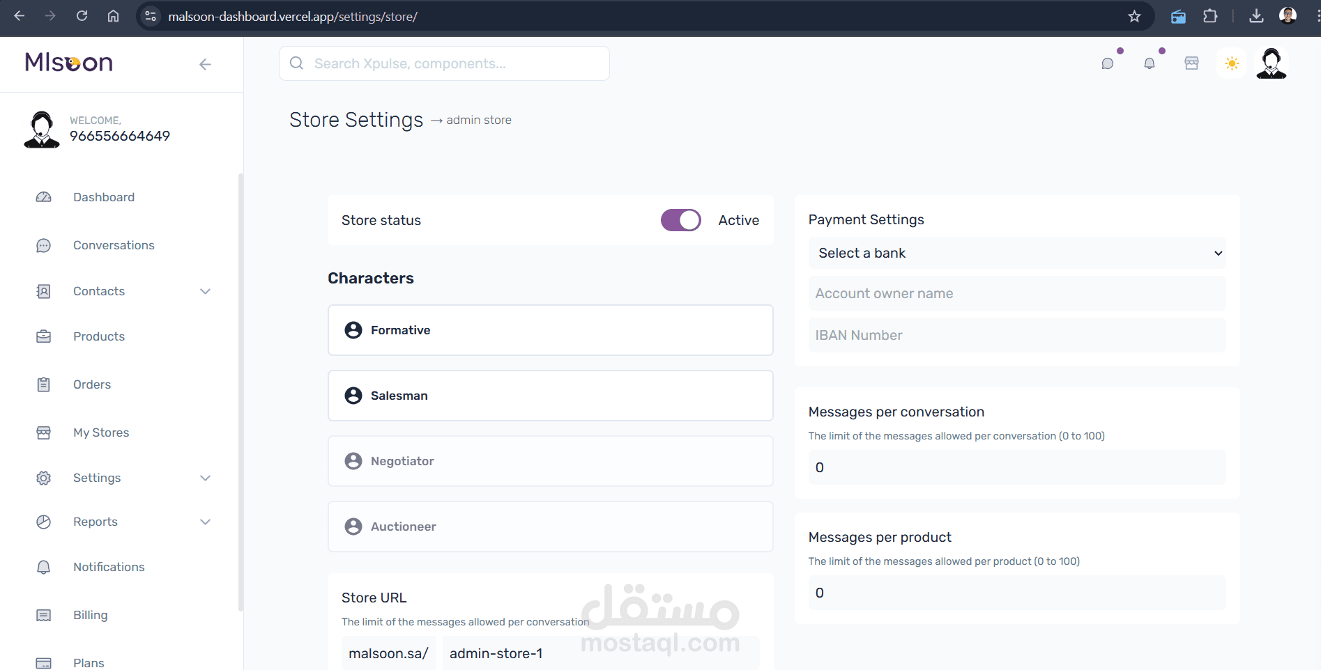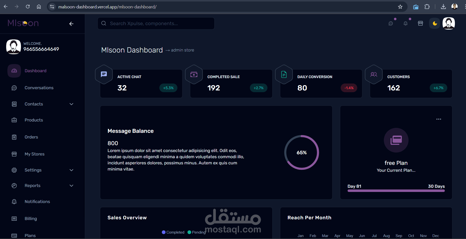 لوحة تحكم منصة ملسون لخدمات البيع عن طريق الذكاء الاصطناعي والتي تشمل العديد من الخصائص: