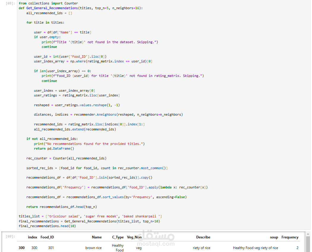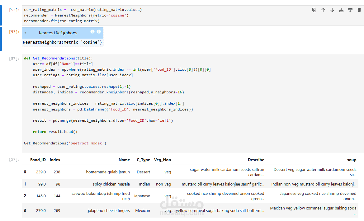 باستخدام بيانات تفاعل المستخدم مع الأطعمة، قمنا بتطبيق أقرب الجيران (Nearest Neighbors) مع التشابه الكوني للتوصية بالأطباق بناءً على التقييمات السابقة.