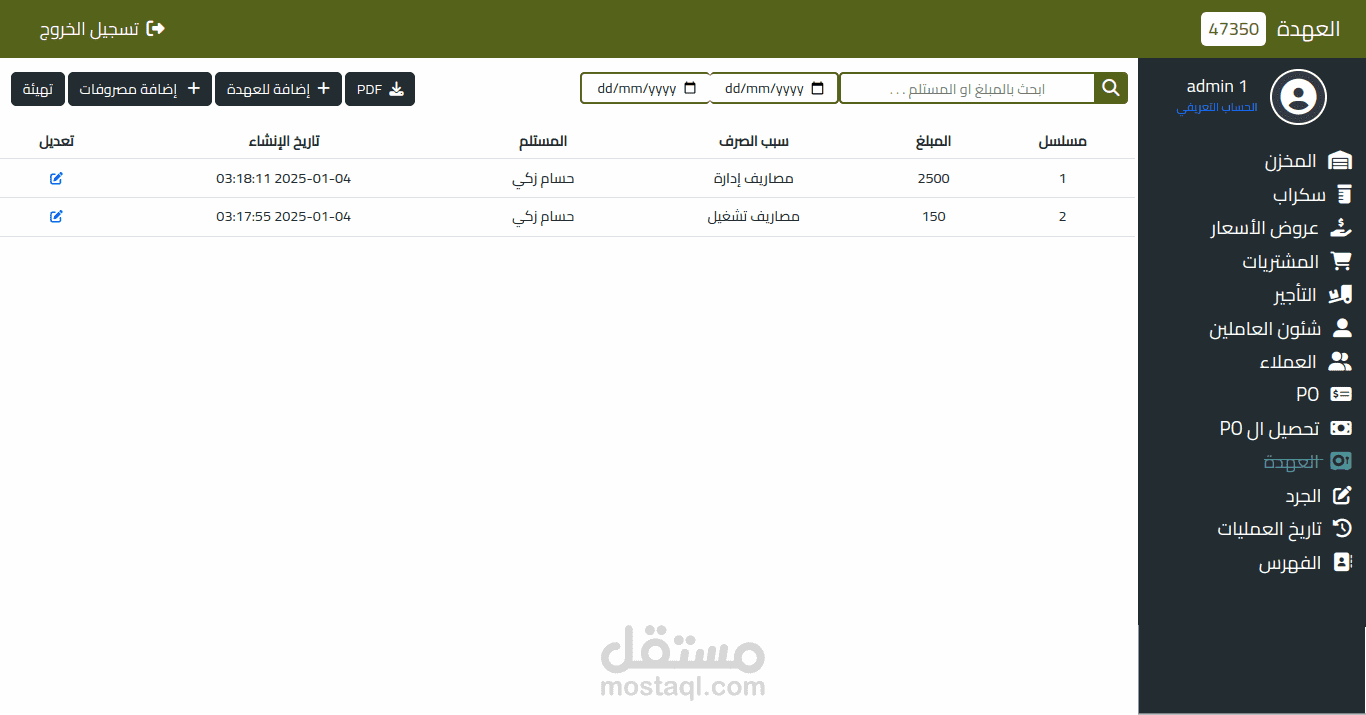 تسجيل العهدة الممنوحة للموظفين أو الأقسام ومتابعتها.