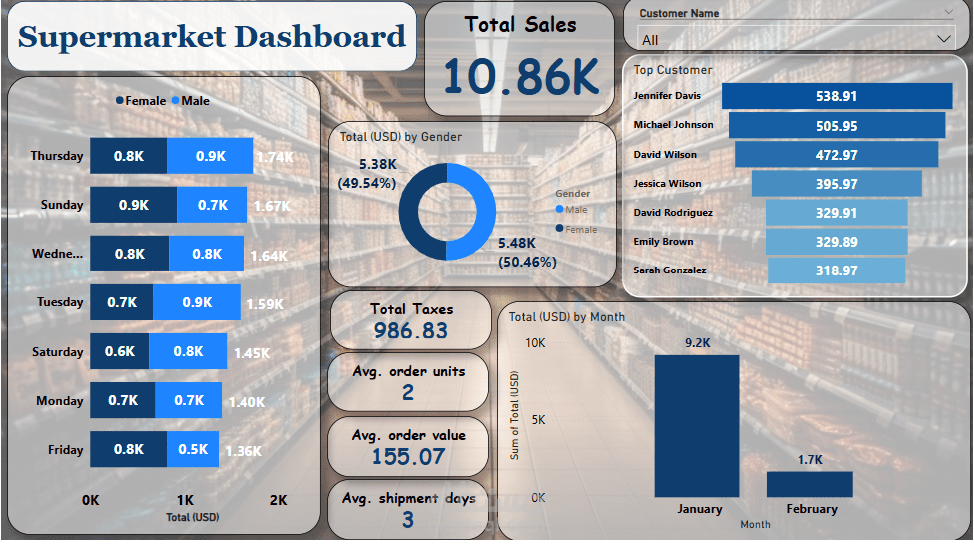 توفر هذه الـ Dashboard في Power BI تحليلاً شاملاً لبيانات مبيعات السوبرماركت، مما يساعد في فهم سلوك العملاء واتجاهات المبيعات وكفاءة العمليات. تشمل الميزات الرئيسية:
