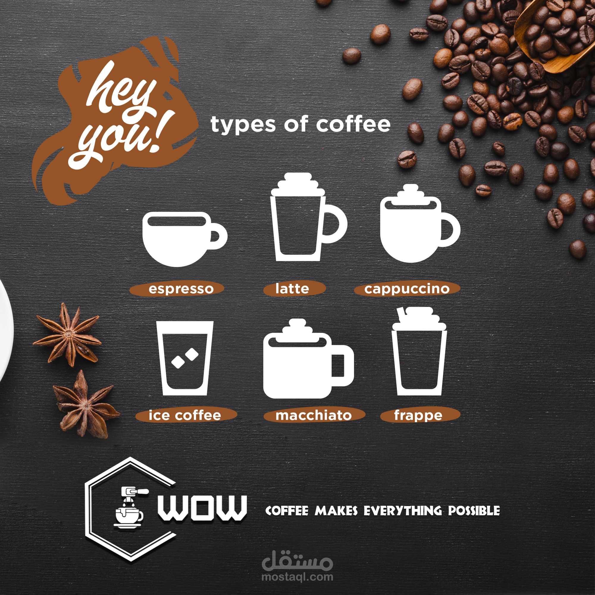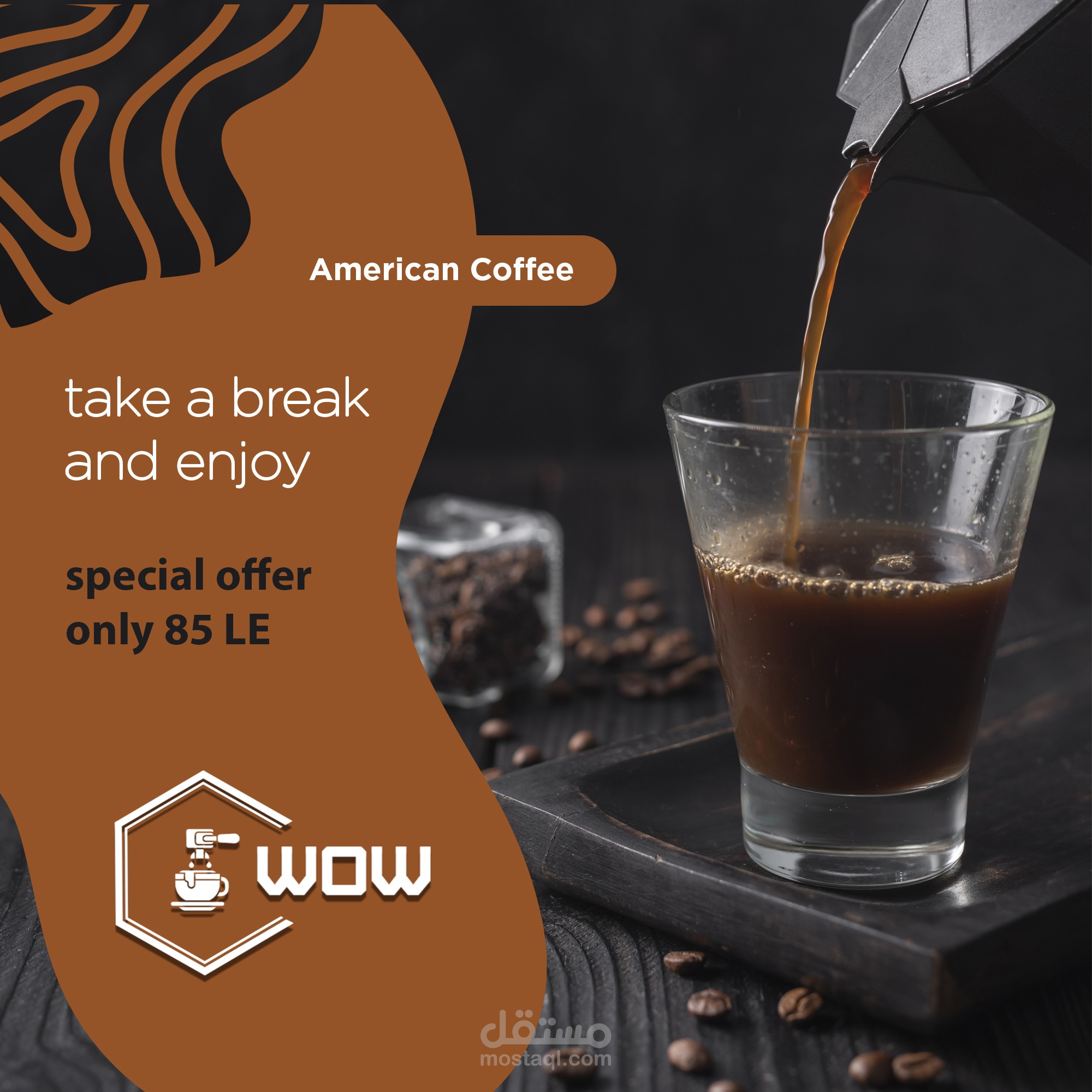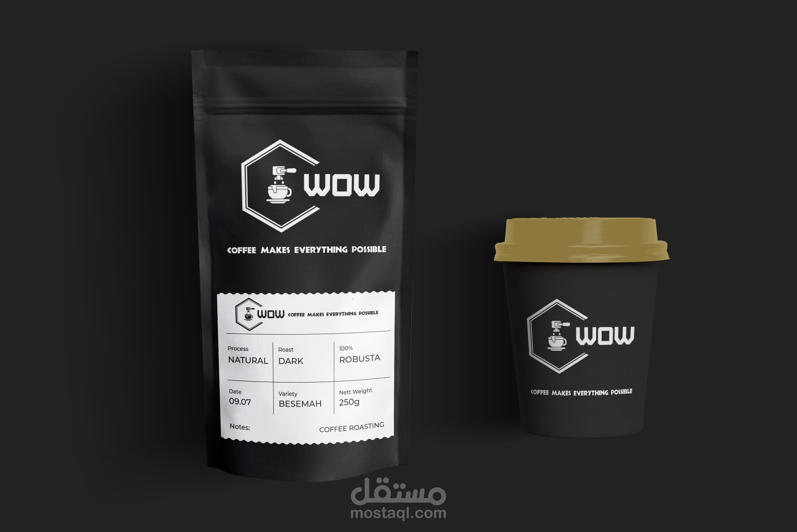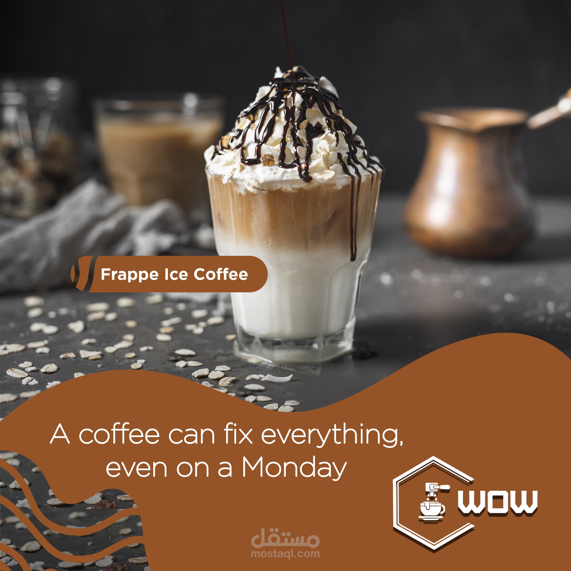 تنفيذ وتصميم مشروع جديد وهوية بصرية جديده بعنوان ( WOW -- COFFEE SHOP ) وتم تنفيذ المشروع بكل احتياجاته من ( Logo -Banner - Business card - Mockups - Posts &Stories for Social Media - 3D Promotional Video )