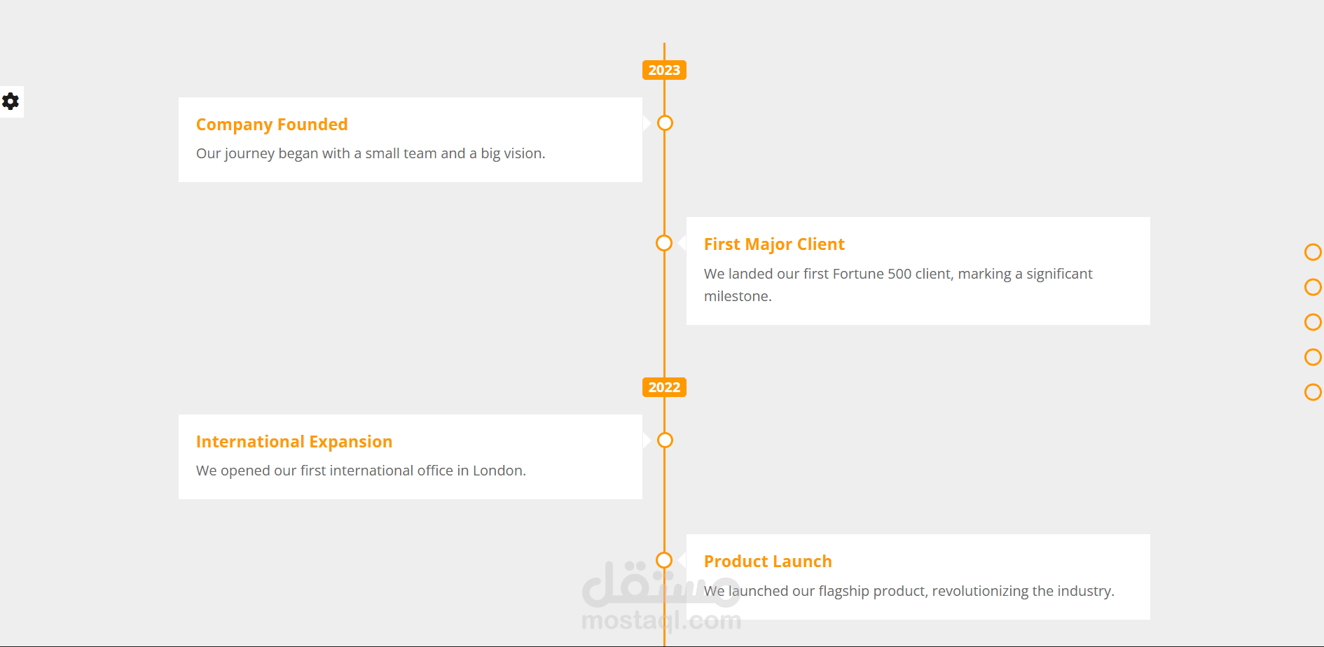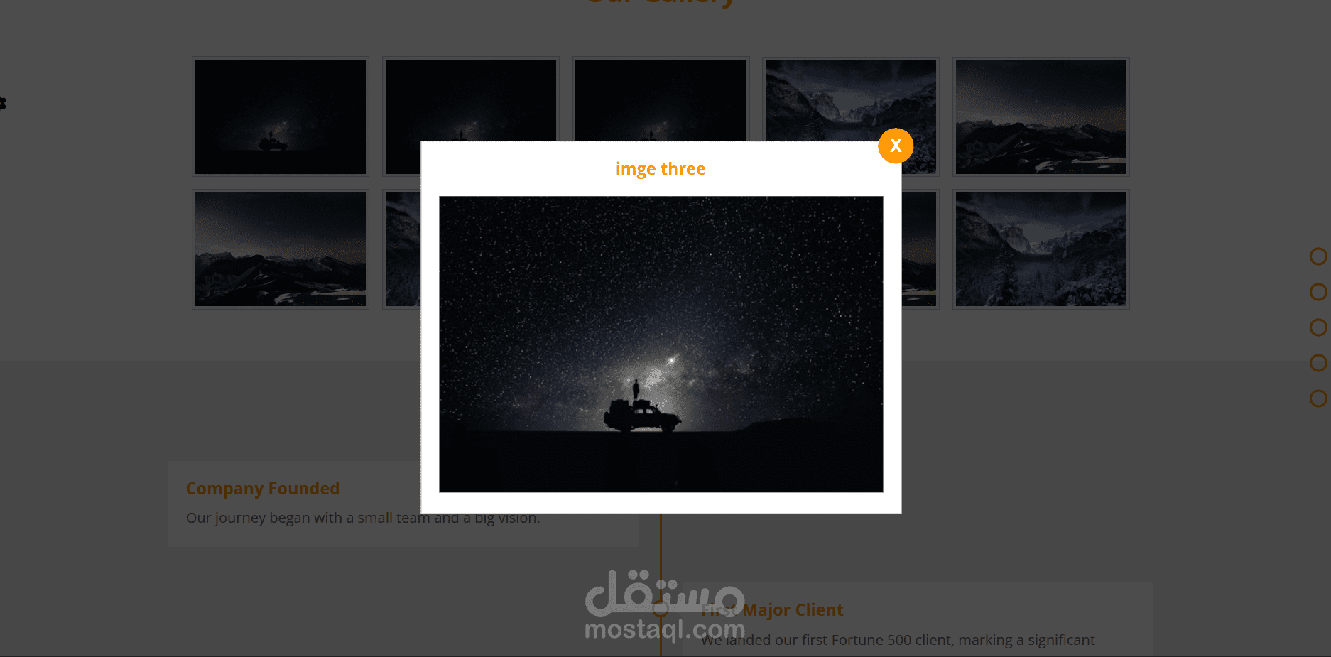 شريط تنقل سهل الاستخدام يتيح للزوار الانتقال بين أقسام الموقع: "عن الشركة"، "المهارات"، "المعرض"، "الجدول الزمني"، و"الشهادات".