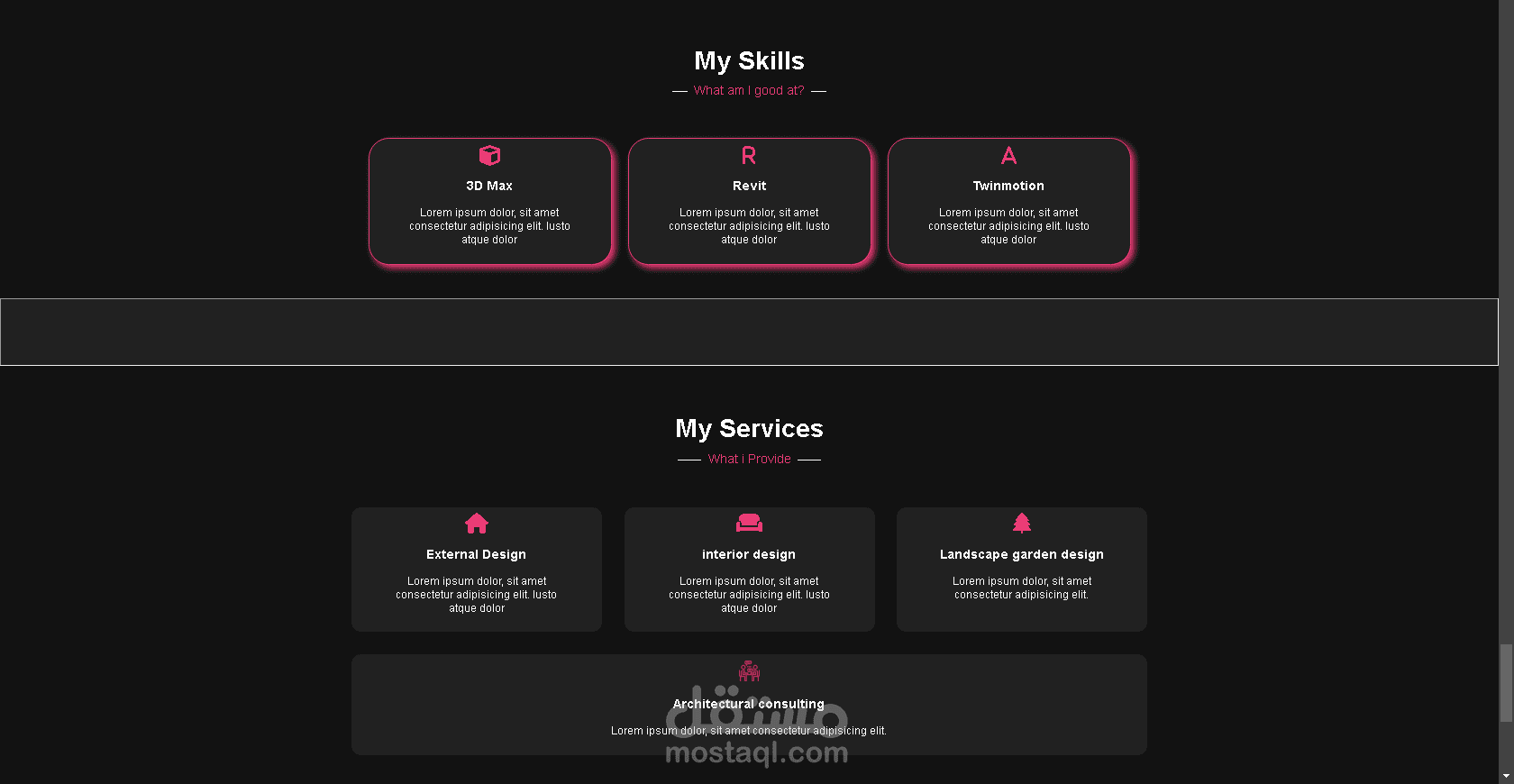 المهارات: برامج التصميم (3D Max، Revit، Twinmotion) مع أيقونات توضيحية.