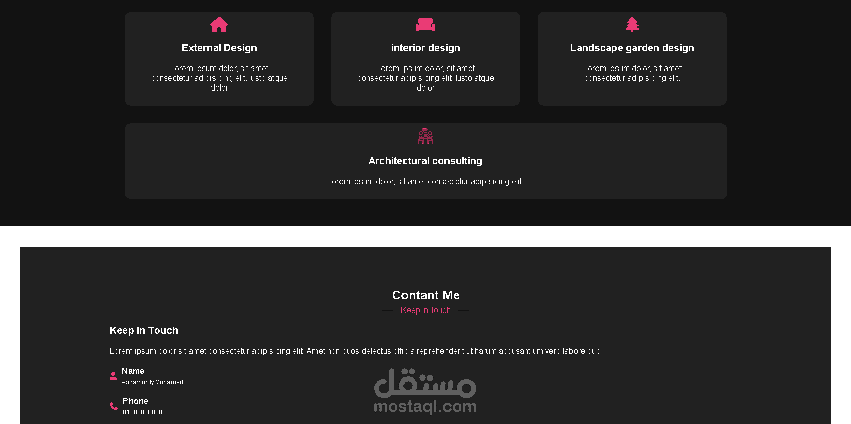 الخدمات: تصميم داخلي وخارجي، تصميم حدائق، استشارات معمارية.