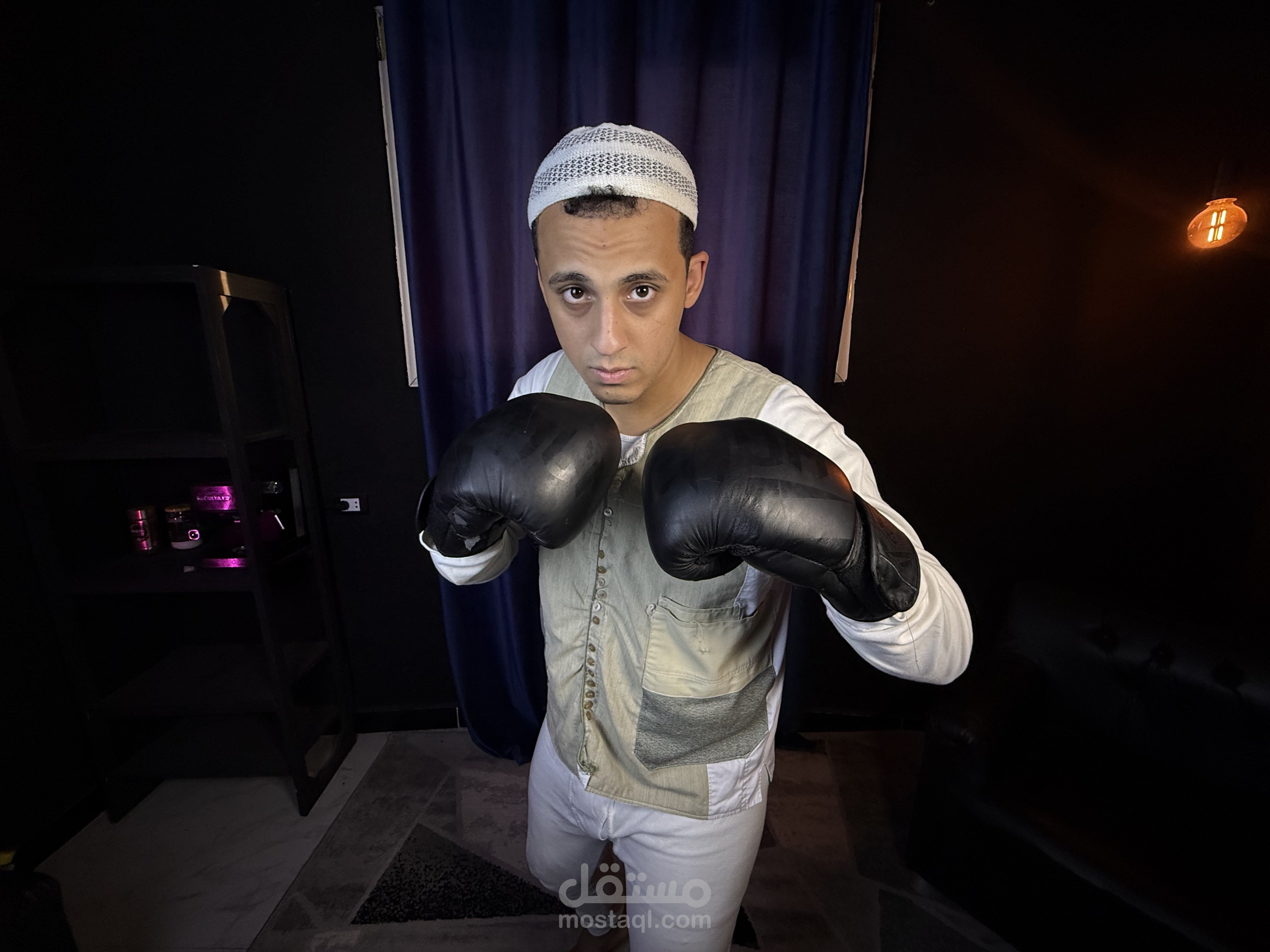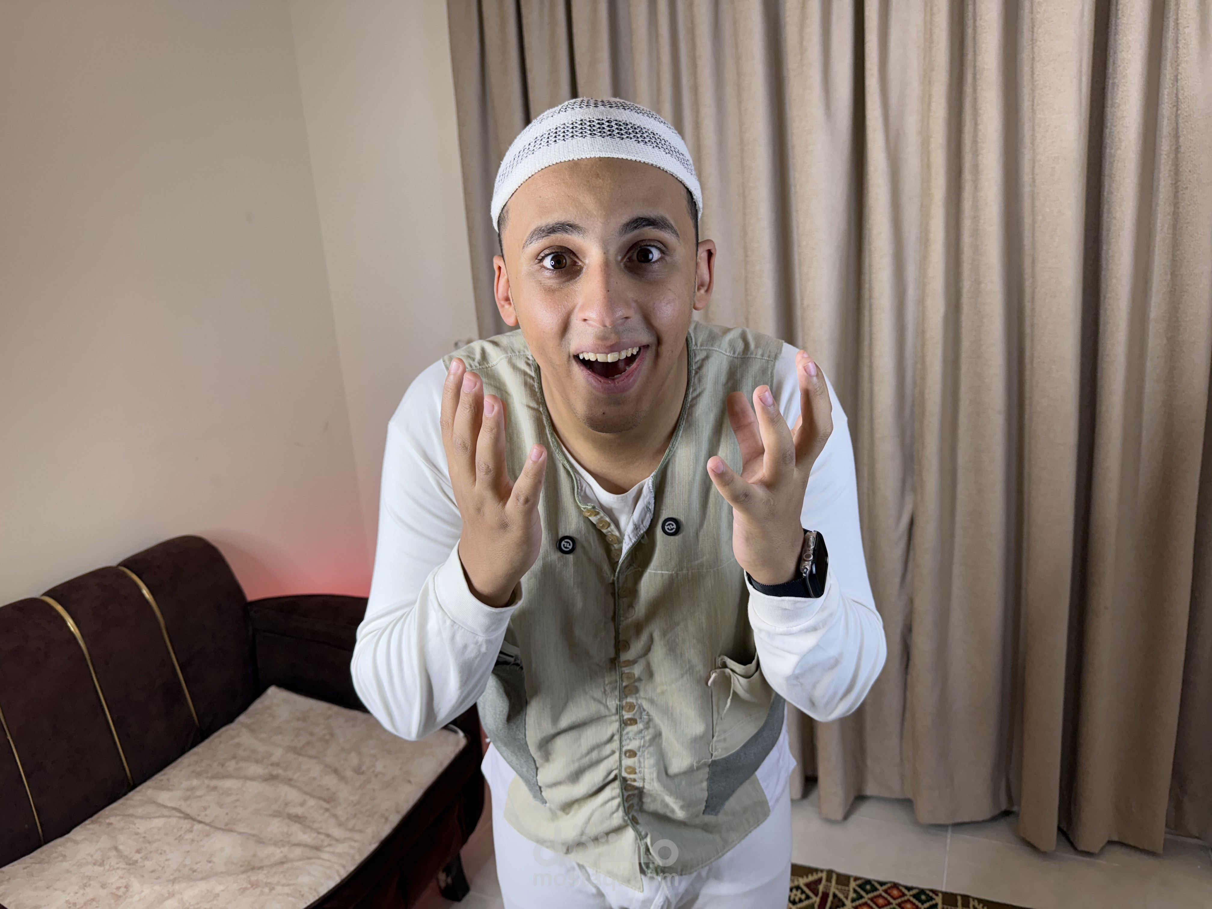 A young man, likely in his late teens or early twenties, of Middle Eastern/North African descent, is depicted in a stylized classroom setting. He is positioned slightly off-center to the right of the image. He is wearing a light gray/beige long-sleeved shirt and a graduation cap, with a yellow/gold band. The cap is slightly tilted. He has a thoughtful expression, holding a book and a pen in his mouth. His body posture suggests concentration and engagement. The man is holding a notebook with a spiral binding and design on its cover. The background depicts a classroom with a chalkboard and other classroom elements, rendered in a collage style with patterned paper and torn edges. The colors are a mix of muted greens, browns, tans, and hints of yellow/gold. The lighting is soft and ambient, focused on the subject, with the overall style appearing comic or animated. The perspective is close-up, emphasizing the subject's facial features. The composition is a collage-style design, using