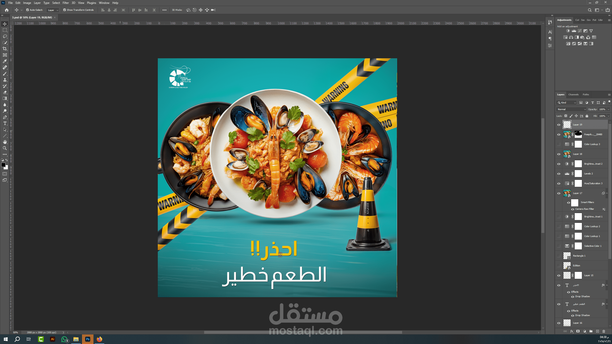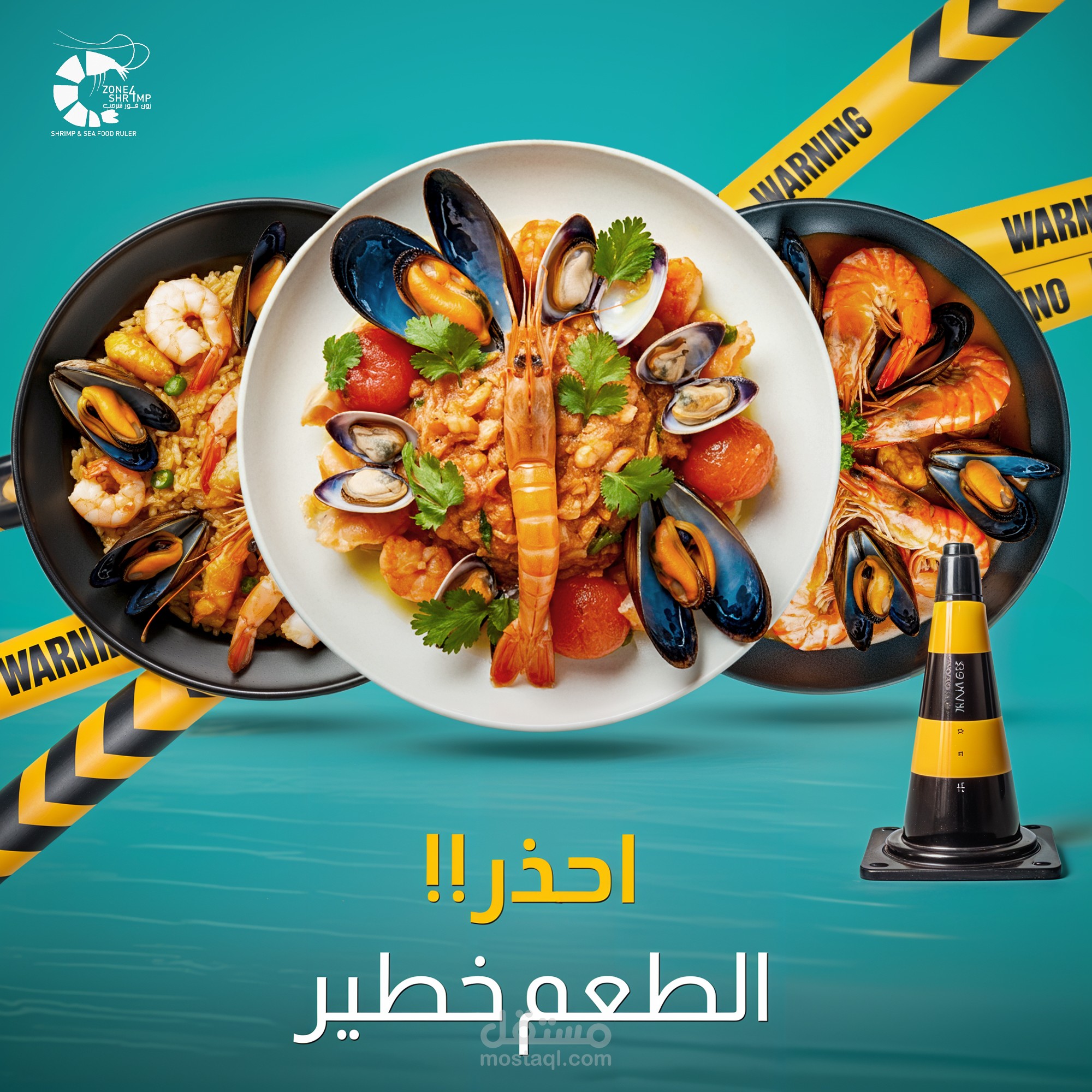 A plate of cooked shrimp, seasoned and served in a parchment paper container, sits atop a dark gray plate. The shrimp are a reddish-brown color, glistening with a spicy-looking sauce. A few pieces of corn are visible next to the shrimp. A lemon wedge is also present on top of the shrimp. The plate is positioned in the center of the image, situated on a sandy beach. The background features a stylized depiction of ocean waves lapping at the shore. The sand is a light beige color. A seashell is visible at the bottom left of the image. The overall style is a photo advertisement for a restaurant, or seafood eatery, designed to evoke a beachy, summer vibe. The lighting is bright and highlights the food, emphasizing the colors and textures. The composition is centered around the dish, with the beach elements and stylized wave patterns providing a background. Arabic text is displayed on the image, adding to the branding. The perspective is slightly above the plate, and the image has an a