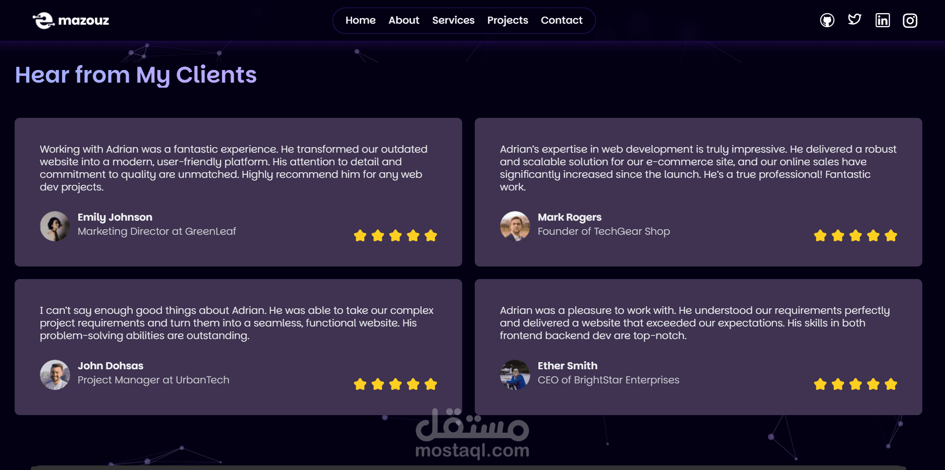 I created a personal portfolio website to showcase my projects and skills. The site features a clean, modern design with responsive layouts, making it accessible on all devices. I implemented sections for my work and Services to offer web tips, as well as contact forms to facilitate client inquiries. I used React, Next.js, Tailwind CSS, and JavaScript to enhance the user experience, which resulted in increased engagement and inquiries about my services.