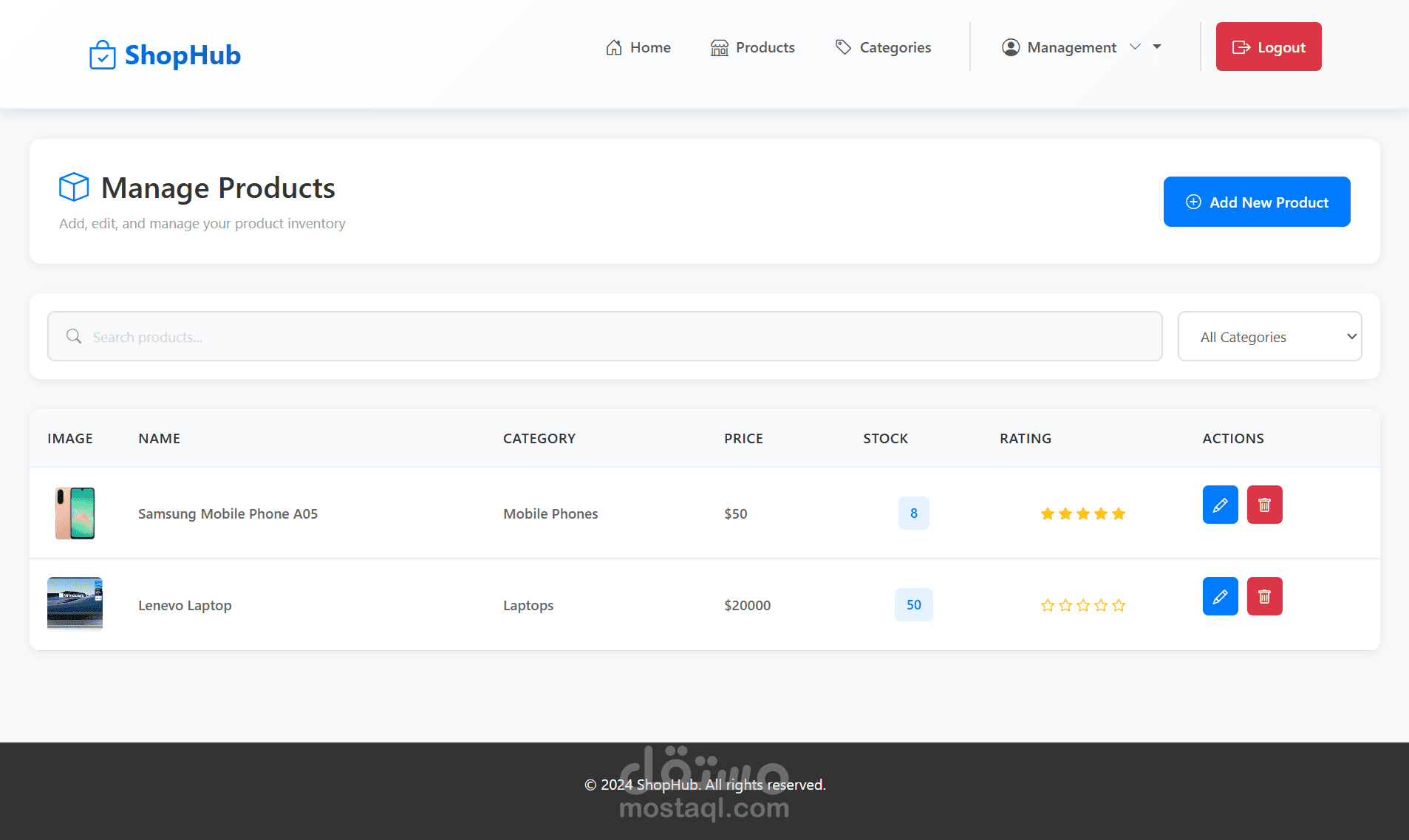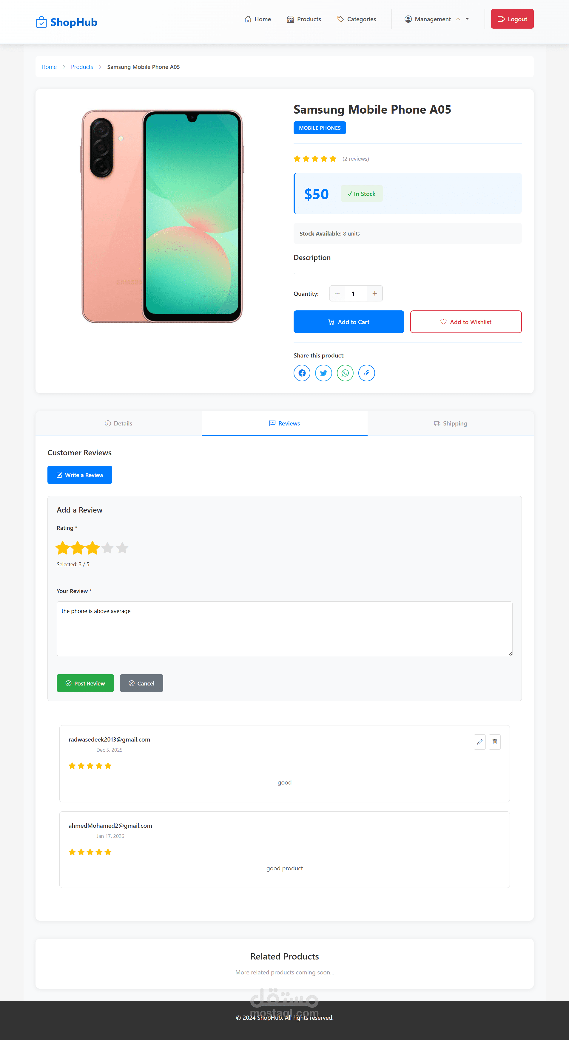 - إضافة وتعديل وحذف تقييمات المنتجات