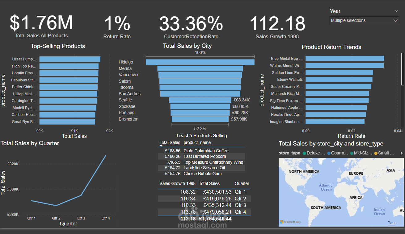 This Power BI dashboard provides a comprehensive analysis of sales performance across different regions, products, and time periods, helping businesses track sales trends, customer retention, and product returns.
