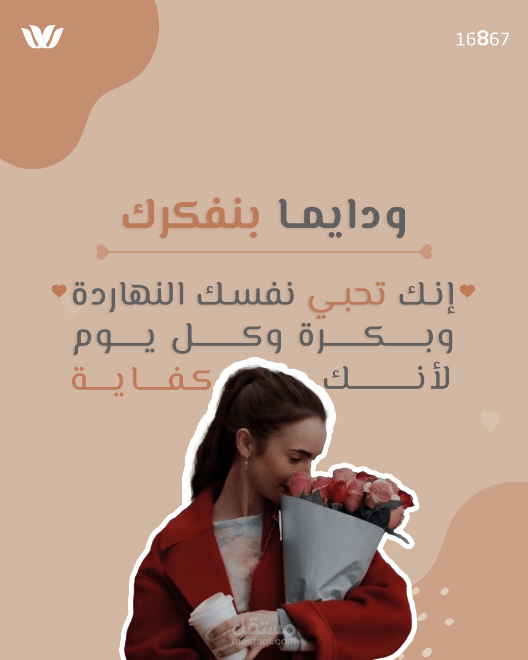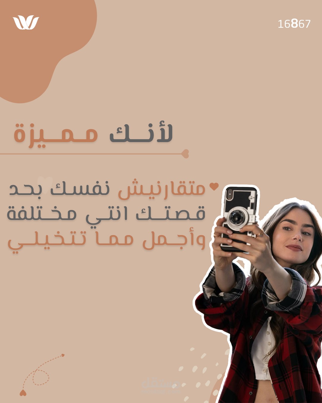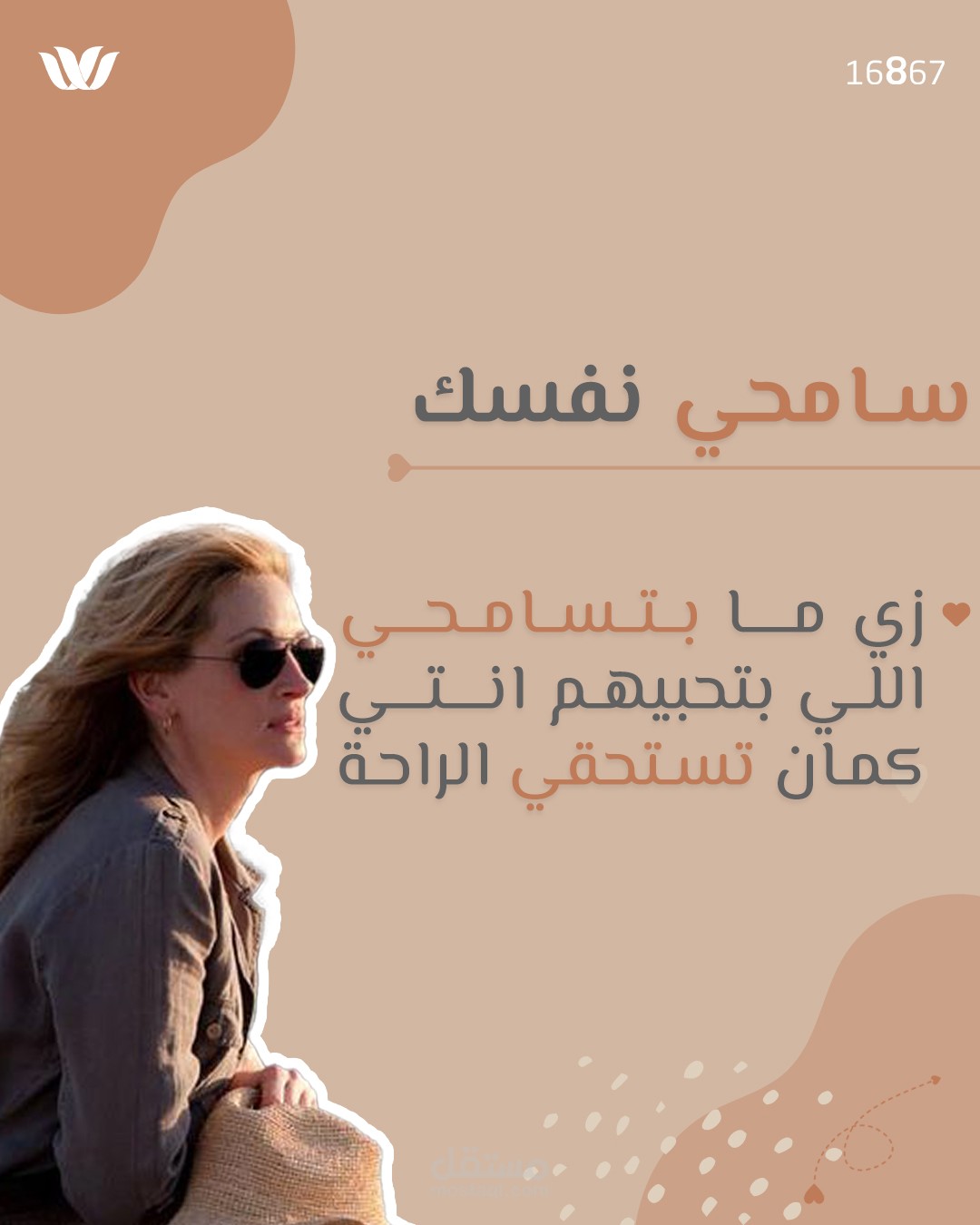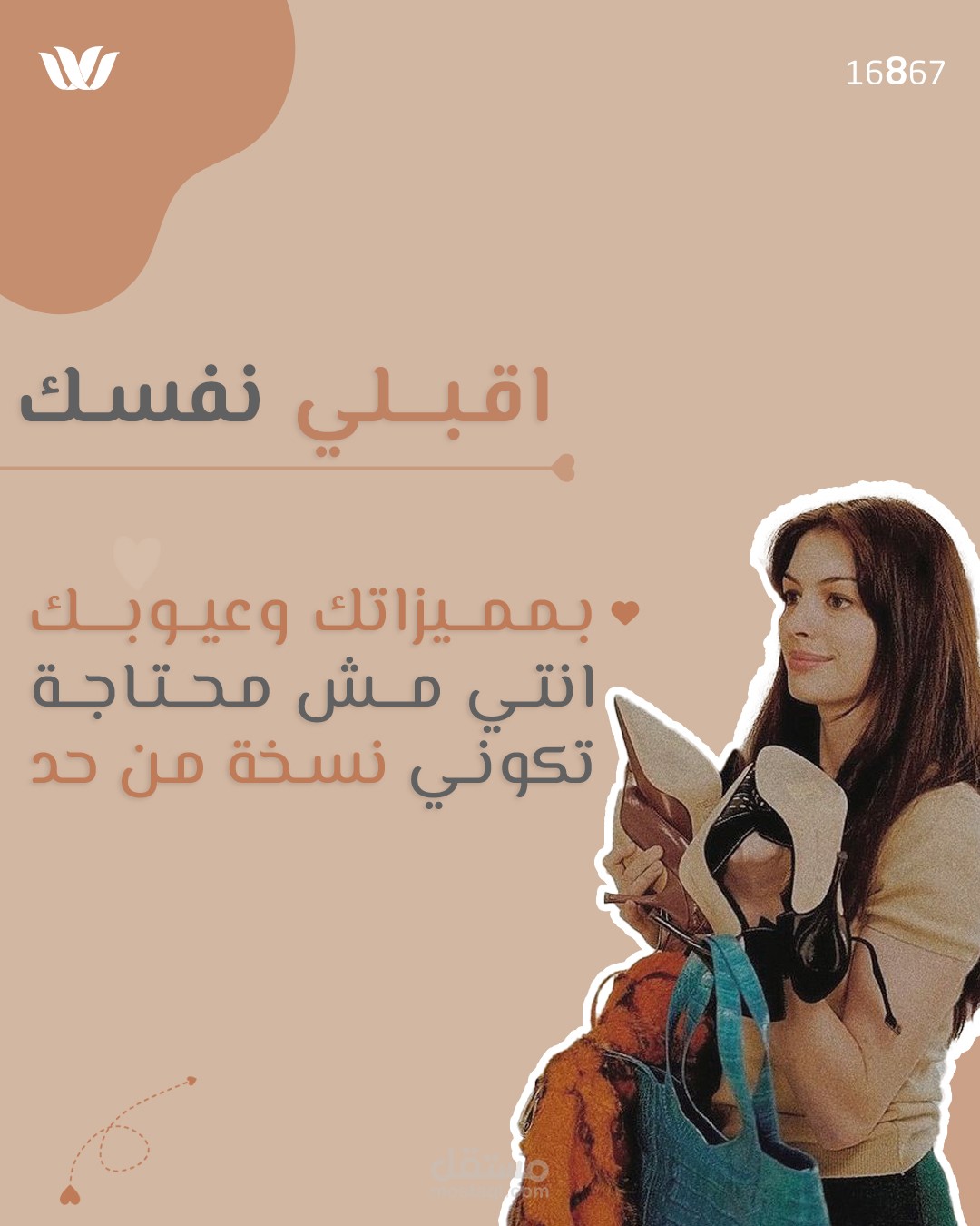 الهدف: تصميم منشور بصري يحمل رسالة إيجابية تدعو إلى حب الذات والاهتمام بها، مما يجعله مناسبًا للمحتوى التحفيزي والتوعوي على منصات التواصل الاجتماعي.