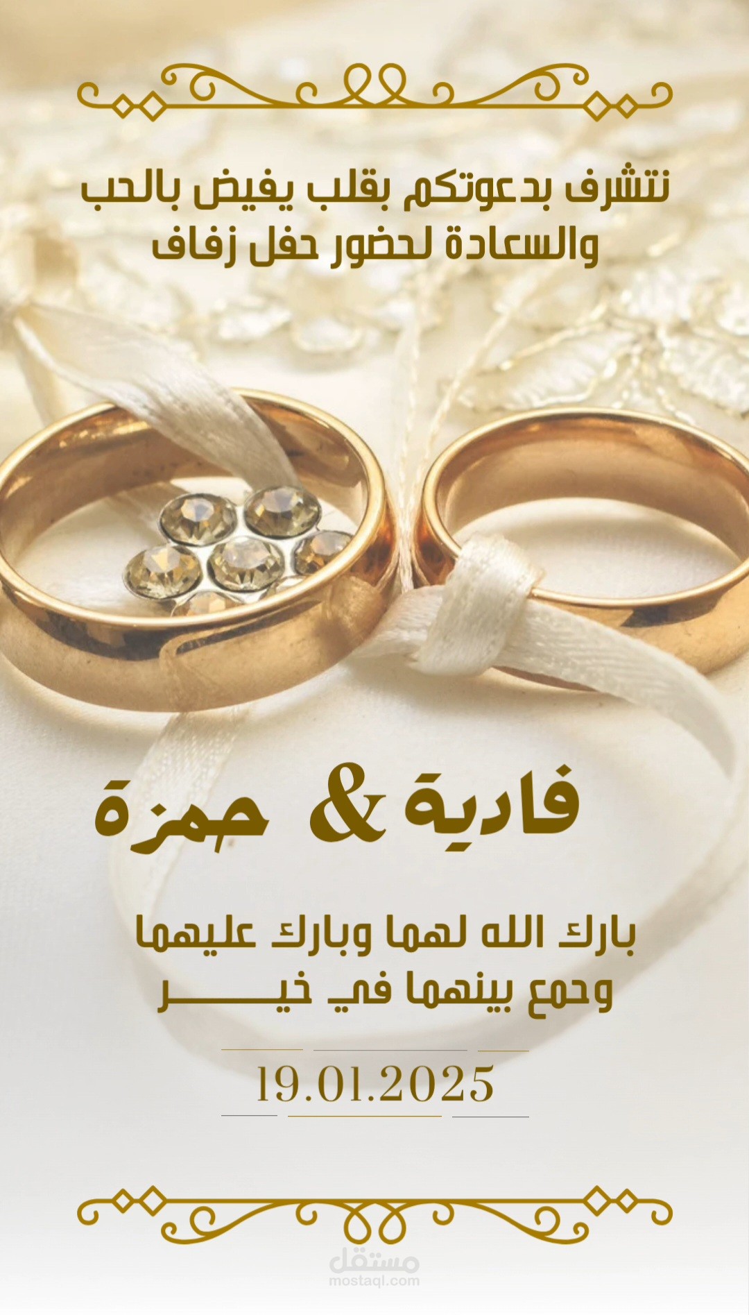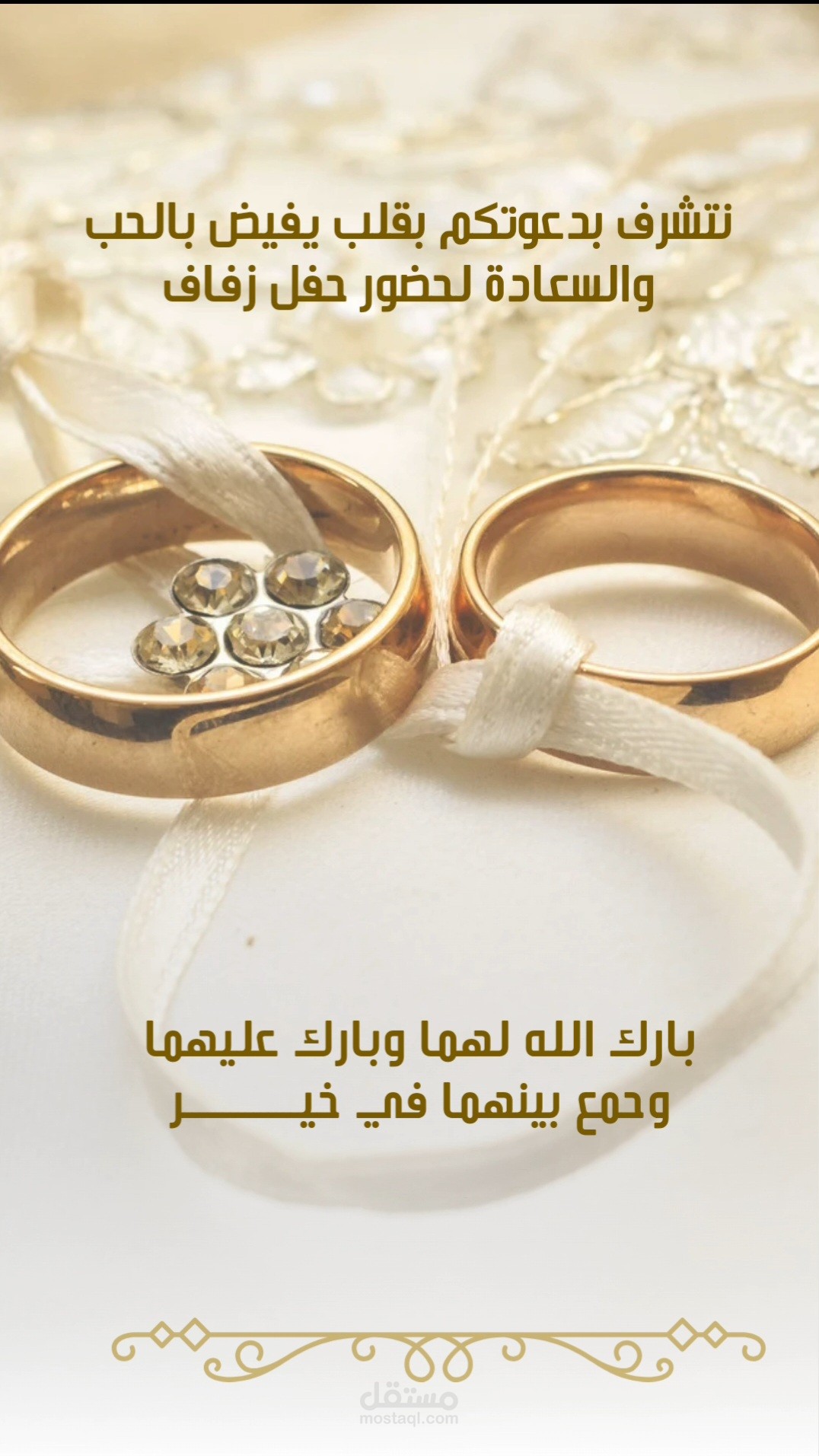 يتم إنشاء التخطيط الأساسي للدعوة، مع توزيع النصوص والعناصر البصرية مثل الزخارف، الإطارات، الرسومات، والرموز الخاصة. يمكن إضافة صور شخصية للعروسين أو زخارف مائية ناعمة.