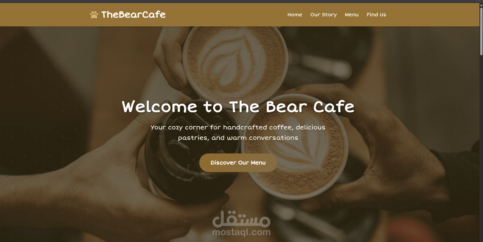 يتميز الموقع بتصميم بسيط وجذاب يركز على الألوان الدافئة واللمسات الجمالية المستوحاة من عالم القهوة، مع توزيع منسق للعناصر وسهولة في التصفح.