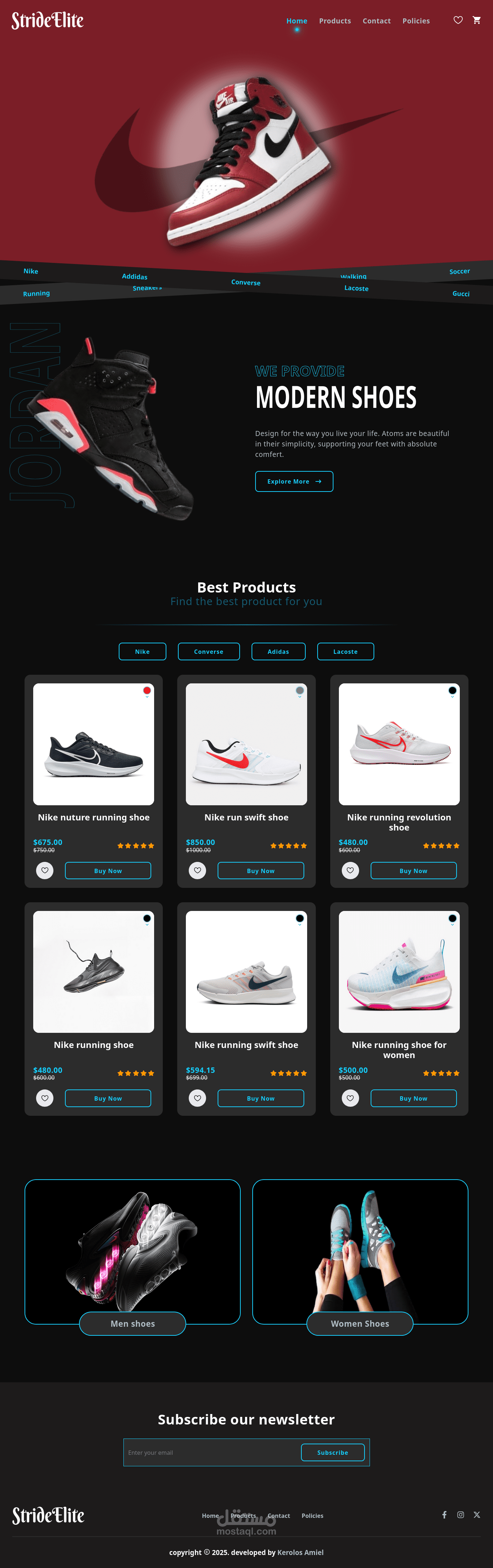 تم تصميم وتطوير موقع StrideElite لبيع الأحذية باستخدام React.js و CSS لإنشاء واجهة مستخدم ديناميكية وجذابة. يتيح الموقع تجربة تسوق سلسة مع عرض المنتجات بطريقة منظمة، بما في ذلك تصنيفات مختلفة مثل Nike, Adidas, Converse, Lacoste.