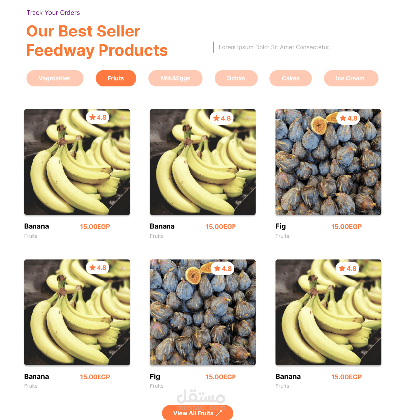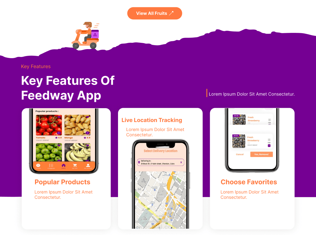 تظهر أرقام مثل "800+" و "1000+" لإبراز عدد المستخدمين أو المنتجات، مما يعطي انطباعًا عن شعبية التطبيق وتنوع المنتجات المتاحة. قسم "Exclusive Benefits Of FeedWay App" يسلط الضوء على المزايا الرئيسية مثل التتبع عبر الإنترنت، المدفوعات الآمنة، والعروض الخاصة، مما يجعل التطبيق جذابًا للمستخدمين. يتم عرض المنتجات الأكثر شعبية في قسم "Our Best Seller Feedway Products"، مما يساعد المستخدمين على اتخاذ قرارات شراء مدروسة.