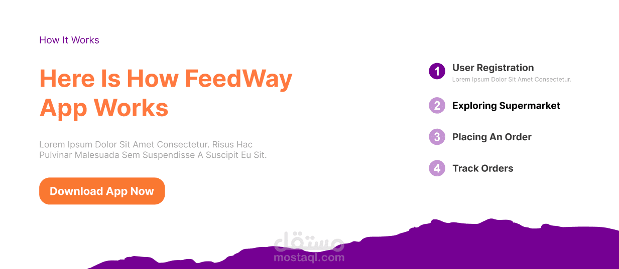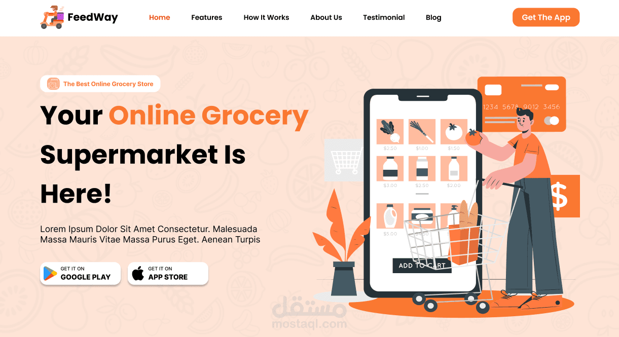 تصميم صفحة الويب الرئيسية لـ FeedWay يتميز بالبساطة والفعالية، مع تركيز قوي على تجربة المستخدم. العنوان الرئيسي "Your Online Grocery Supermarket Is Here!" يلفت الانتباه ويوضح الهدف الأساسي من التطبيق، وهو توفير خدمة تسوق البقالة عبر الإنترنت. زر التحميل "Download Our Online Grocery Mobile App" واضح وبارز، مما يشجع المستخدمين على تحميل التطبيق بسهولة.