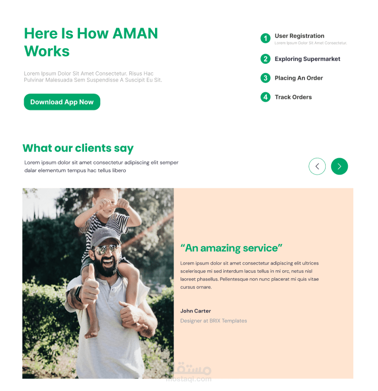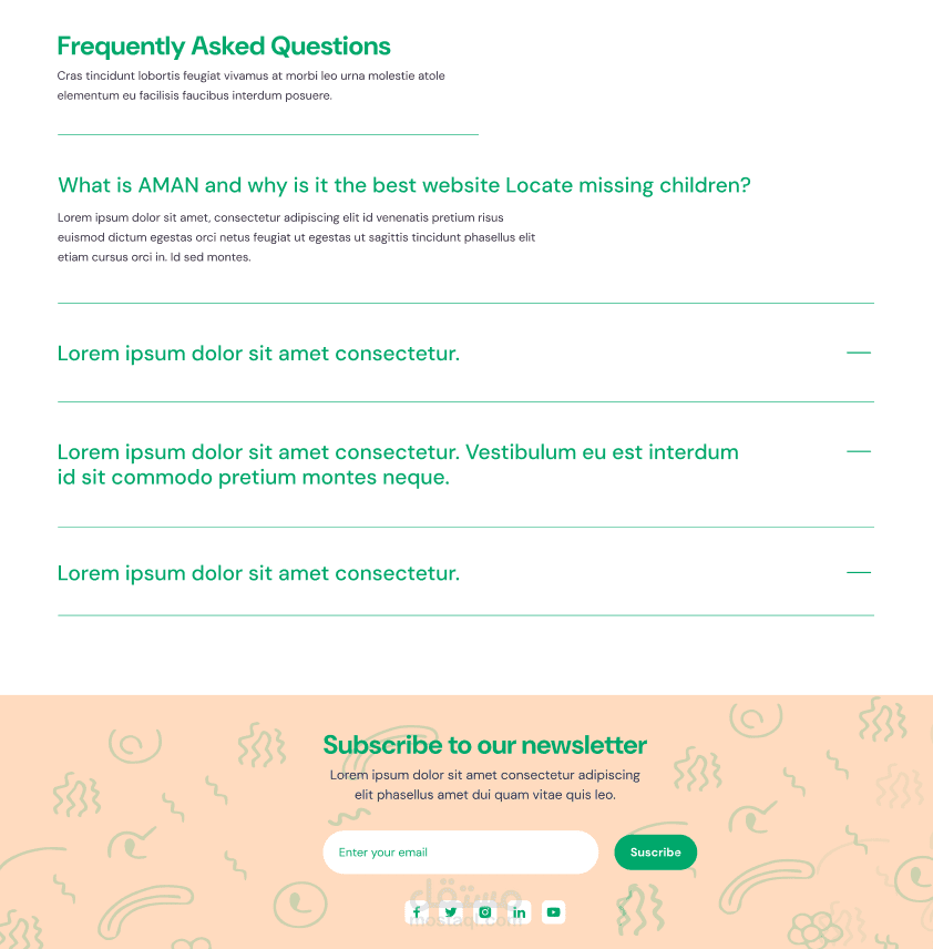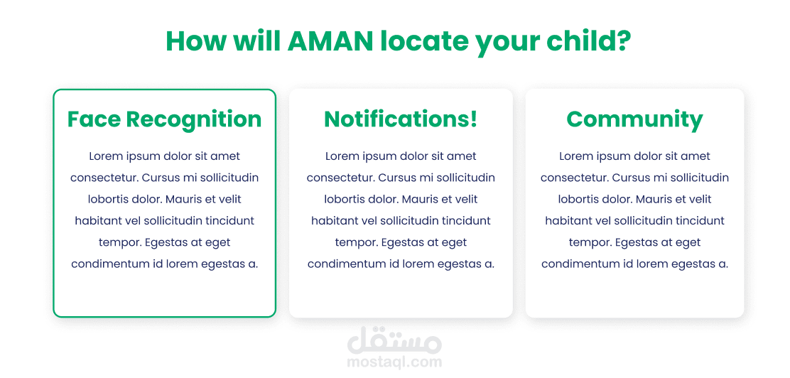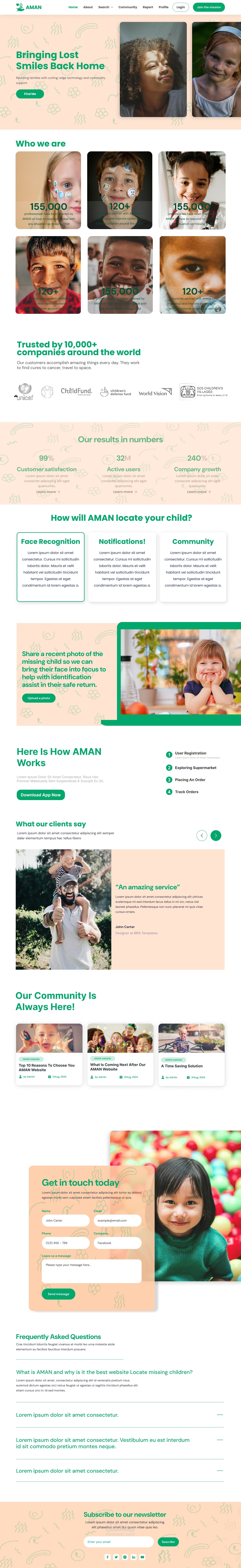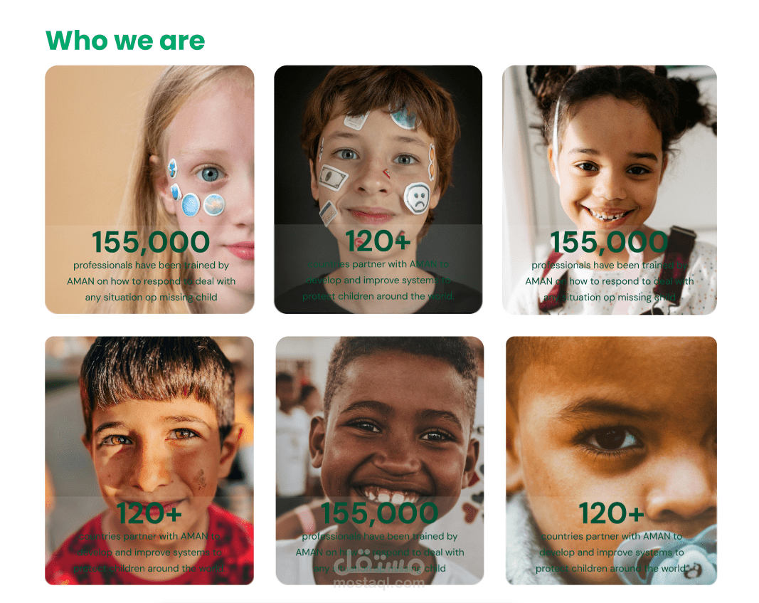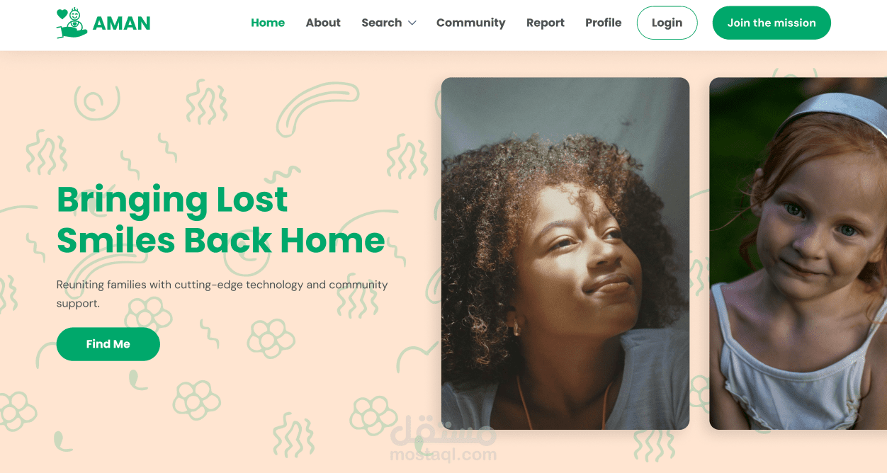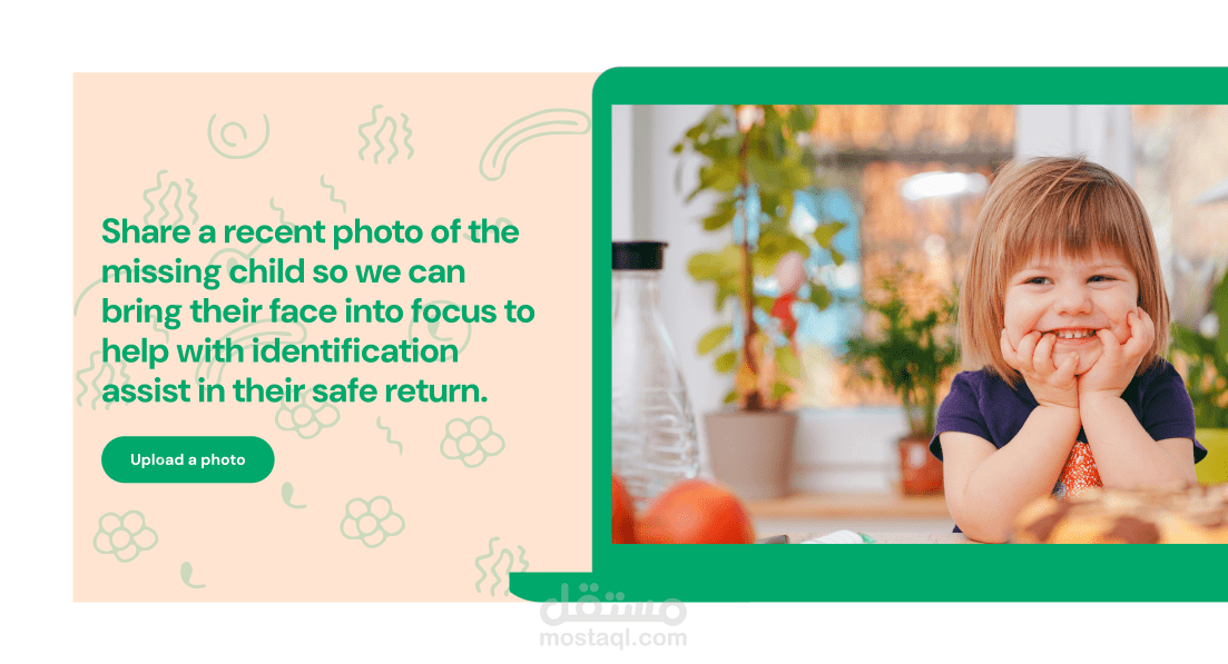 التصميم يتضمن أيضًا أقسامًا تفاعلية مثل "How will AMAN locate your child?"، حيث يتم شرح الخطوات بشكل مرئي باستخدام أيقونات ونصوص مختصرة. يتم تشجيع المستخدمين على تحميل صور للأطفال المفقودين لمساعدة في عملية البحث.