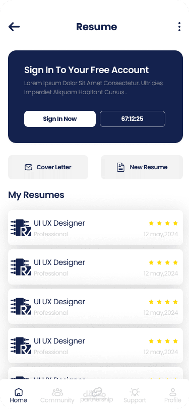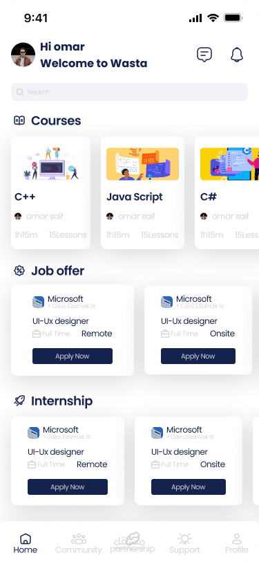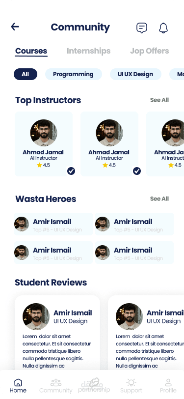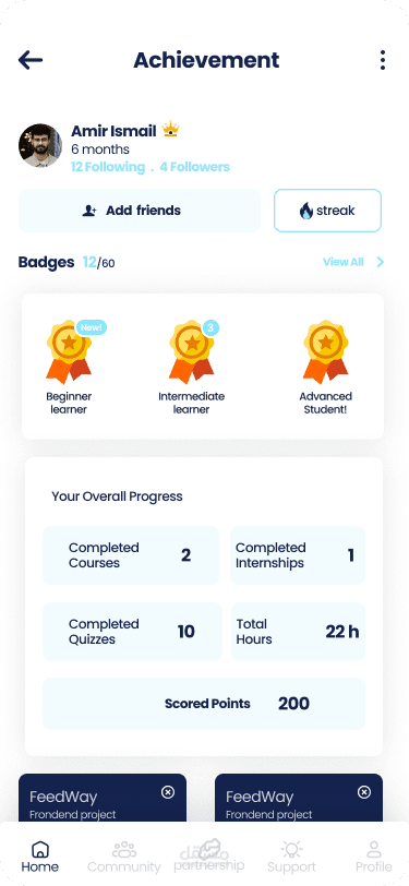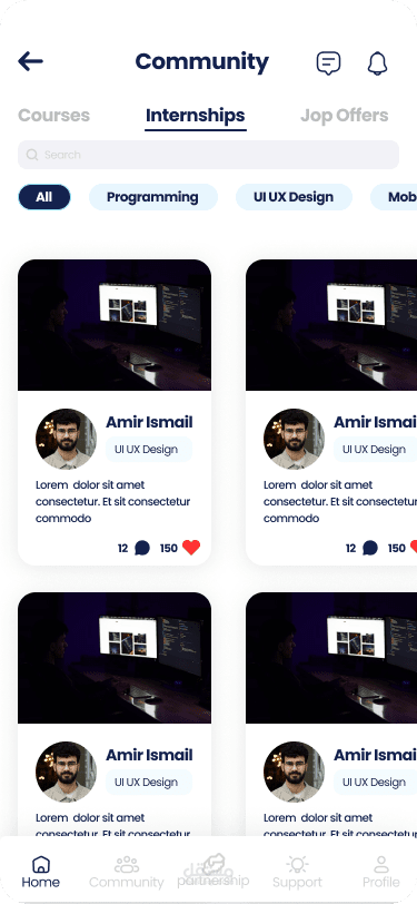 يتميز التصميم أيضًا بوجود اختبارات تفاعلية لقياس معرفة المستخدم، بالإضافة إلى قسم للإشعارات يعرض تنبيهات مهمة مثل مواعيد المقابلات أو نتائج الاختبارات. يمكن للمستخدمين التفاعل مع المجتمع من خلال قسم "Community"، حيث يمكنهم مشاركة الخبرات ورؤية تقييمات الطلاب. يتيح قسم "Settings" للمستخدمين تعديل ملفاتهم الشخصية وإدارة الإشعارات، بينما يعرض قسم "Achievement" إنجازاتهم مثل عدد الدورات التي أكملوها والنقاط التي حصلوا عليها.