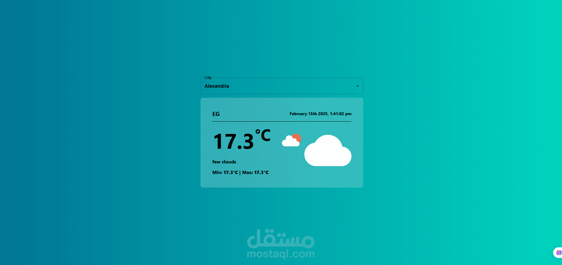 مشروع "The Weather" هو تطبيق ويب يعرض حالة الطقس للمدن المختارة باستخدام بيانات من OpenWeather API. يتميز التطبيق بتصميم أنيق وسهل الاستخدام، حيث يعرض درجة الحرارة الحالية، أدنى وأعلى درجات الحرارة، وصفًا لحالة الطقس، وأيقونة تعبيرية للطقس الحالي.