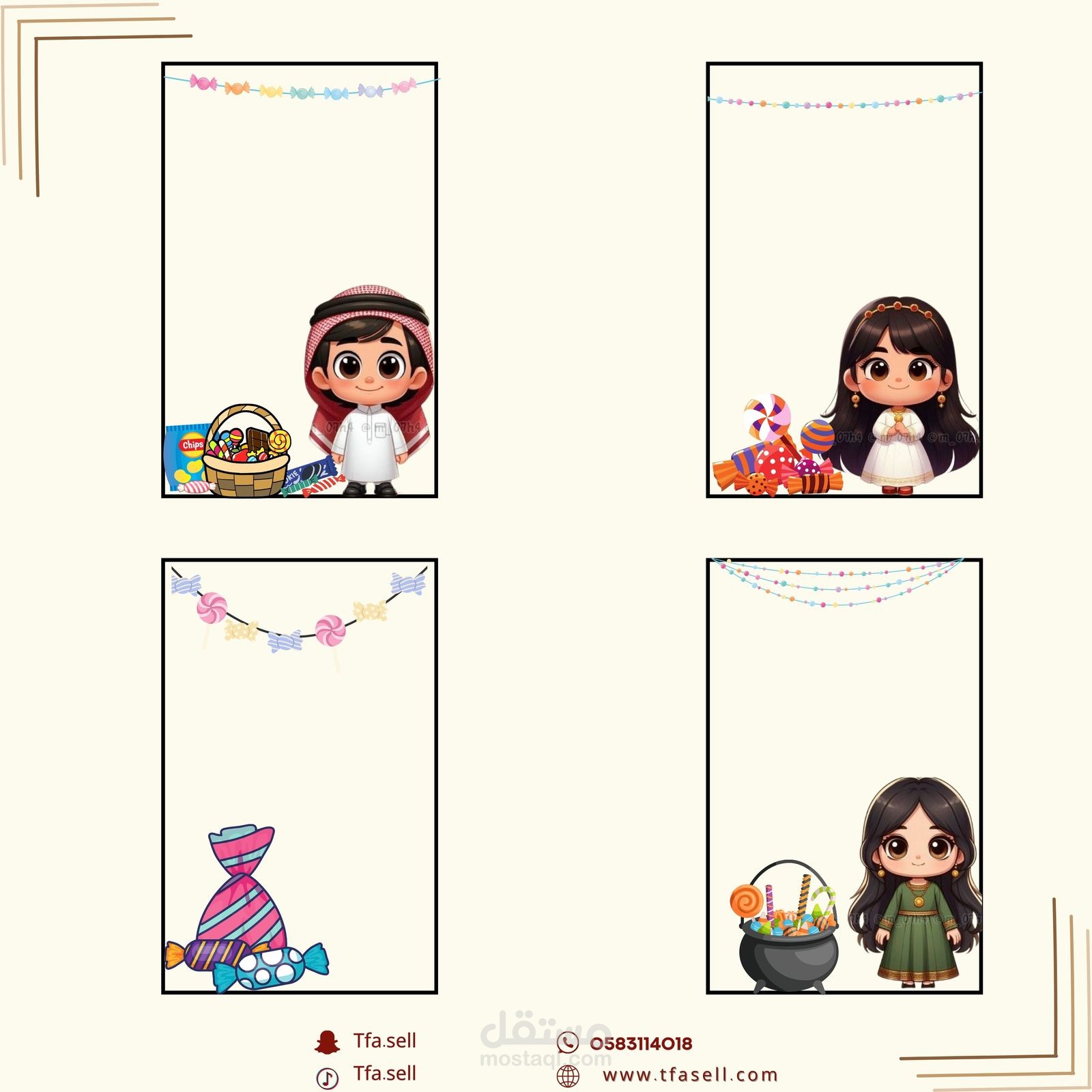توزيعات قرقيعان: أكياس وأغلفة مخصصة للحلوى، علب بألوان زاهية، وتصاميم تعكس تراث الاحتفال بقرقيعان.
