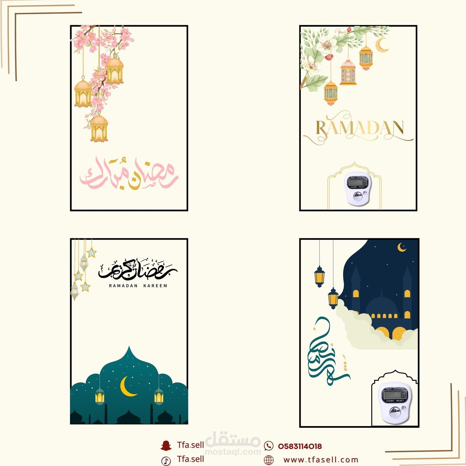 توزيعات رمضان: علب فاخرة، فوانيس مزينة، بطاقات تهنئة، وتصاميم مستوحاة من الأجواء الرمضانية.