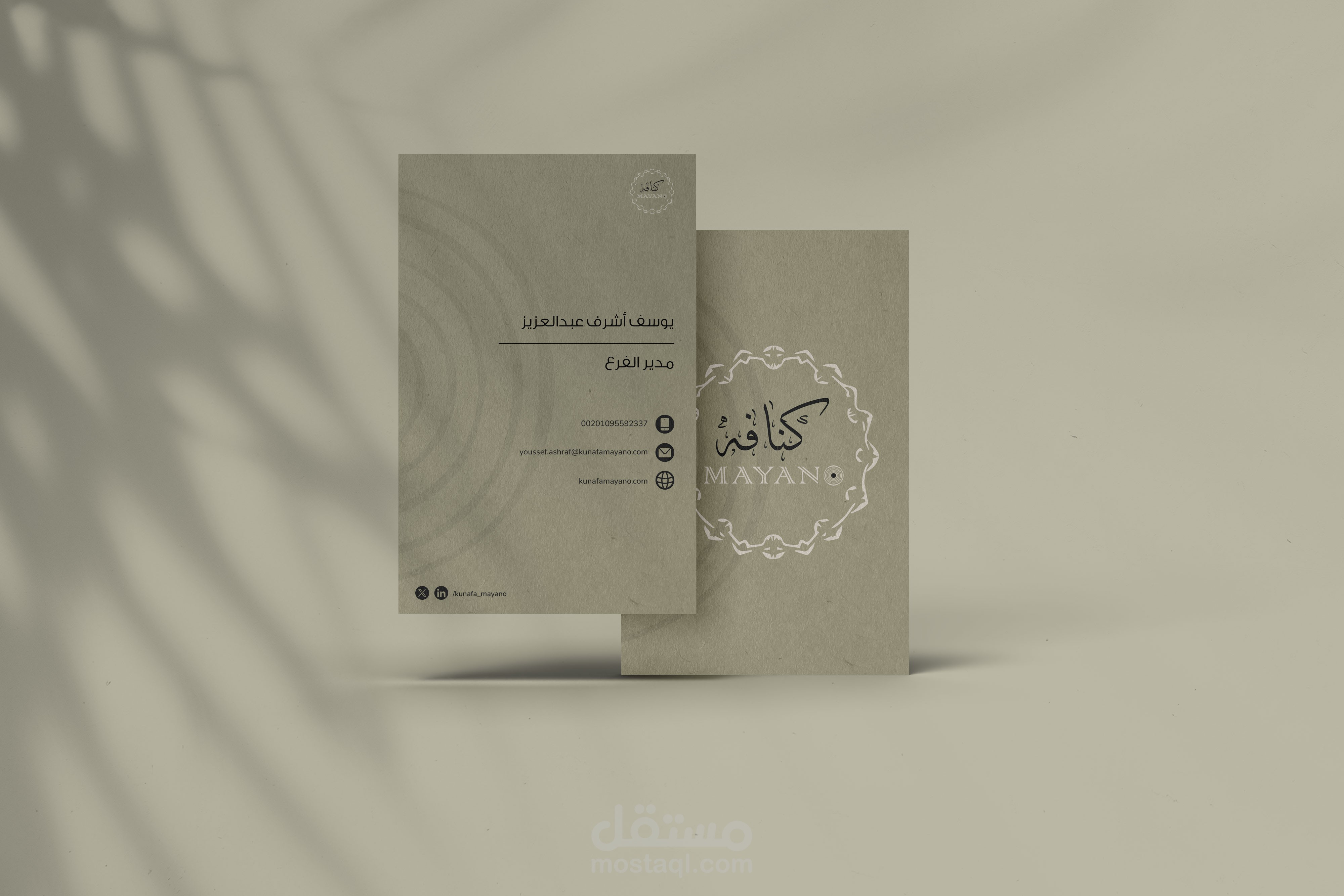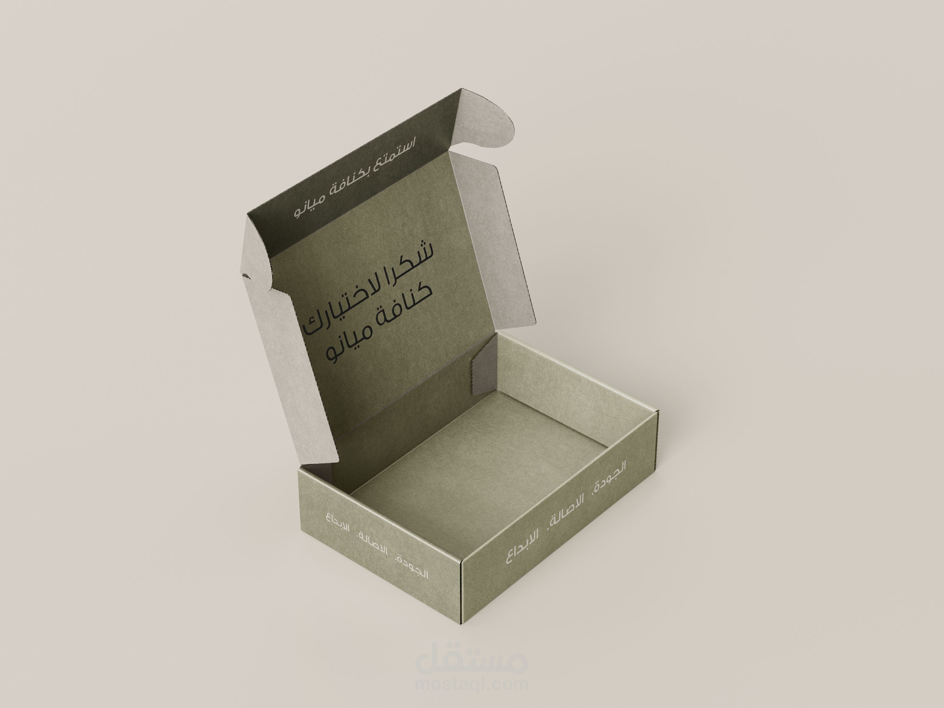 - النتيجة: الهوية البصرية التي تم تصميمها لـ كنافة ميانو أصبحت تعكس جوهر العلامة التجارية بشكل كامل: مزيج من التقاليد الشرقية مع الحداثة، مما ساعد المتجر في تقديم صورة مميزة وسهلة التذكر للعملاء. الشعار المبدع، والألوان الدافئة، والرموز البصرية التي تم استخدامها عززت من حضور المتجر في السوق، مما يجعل الزبائن يشعرون بتجربة فريدة تنطوي على الجودة والطعم الفاخر.