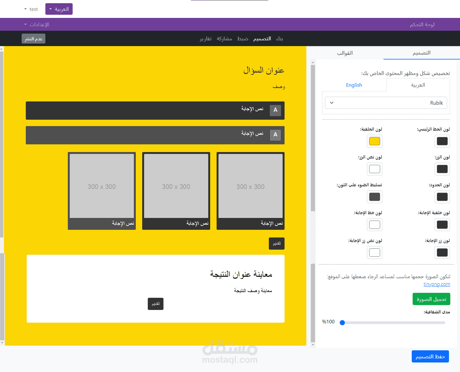 - تخصيص وتعديل كامل لكل تفاصيل صفحة الإختبار (تغيير الألوان والخطوط لكل العناصر)